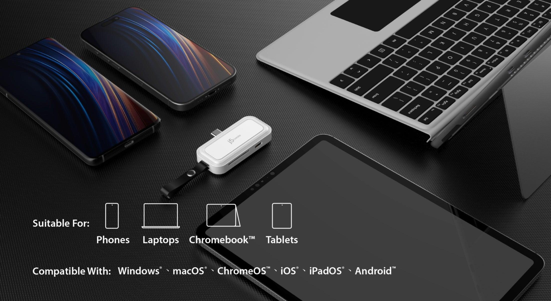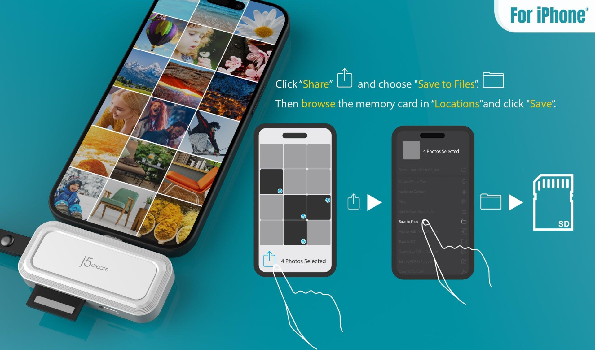 The j5create JCHSD34 allows you to expand your storage for iPad®, iPhone® or Android™ phone. Use the SD™ / microSD™ Adapter to exchange photos and videos among iPhone®, iPad®, PC and Mac® quickly and easily.