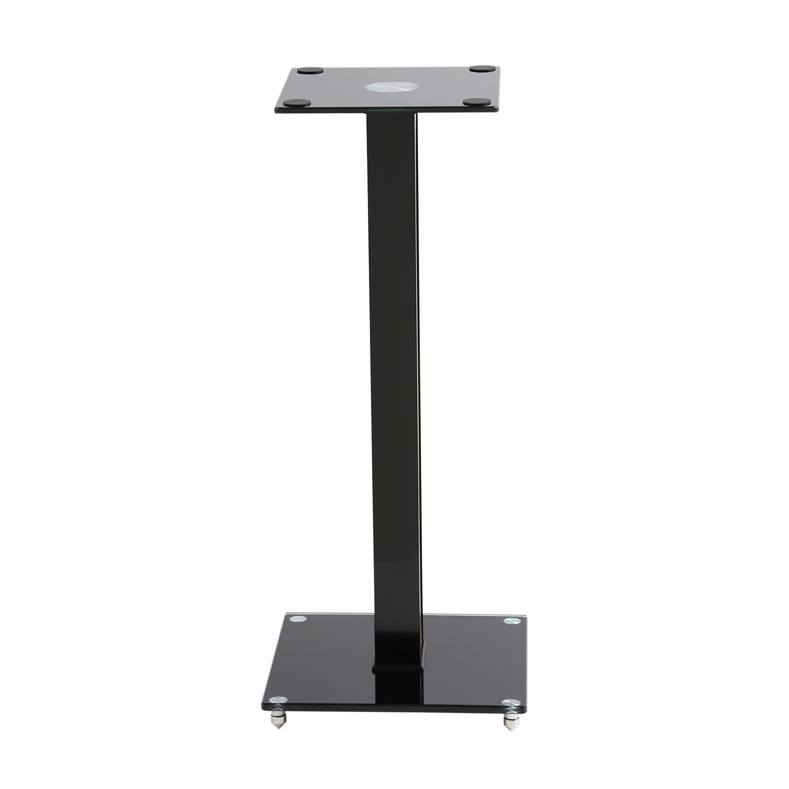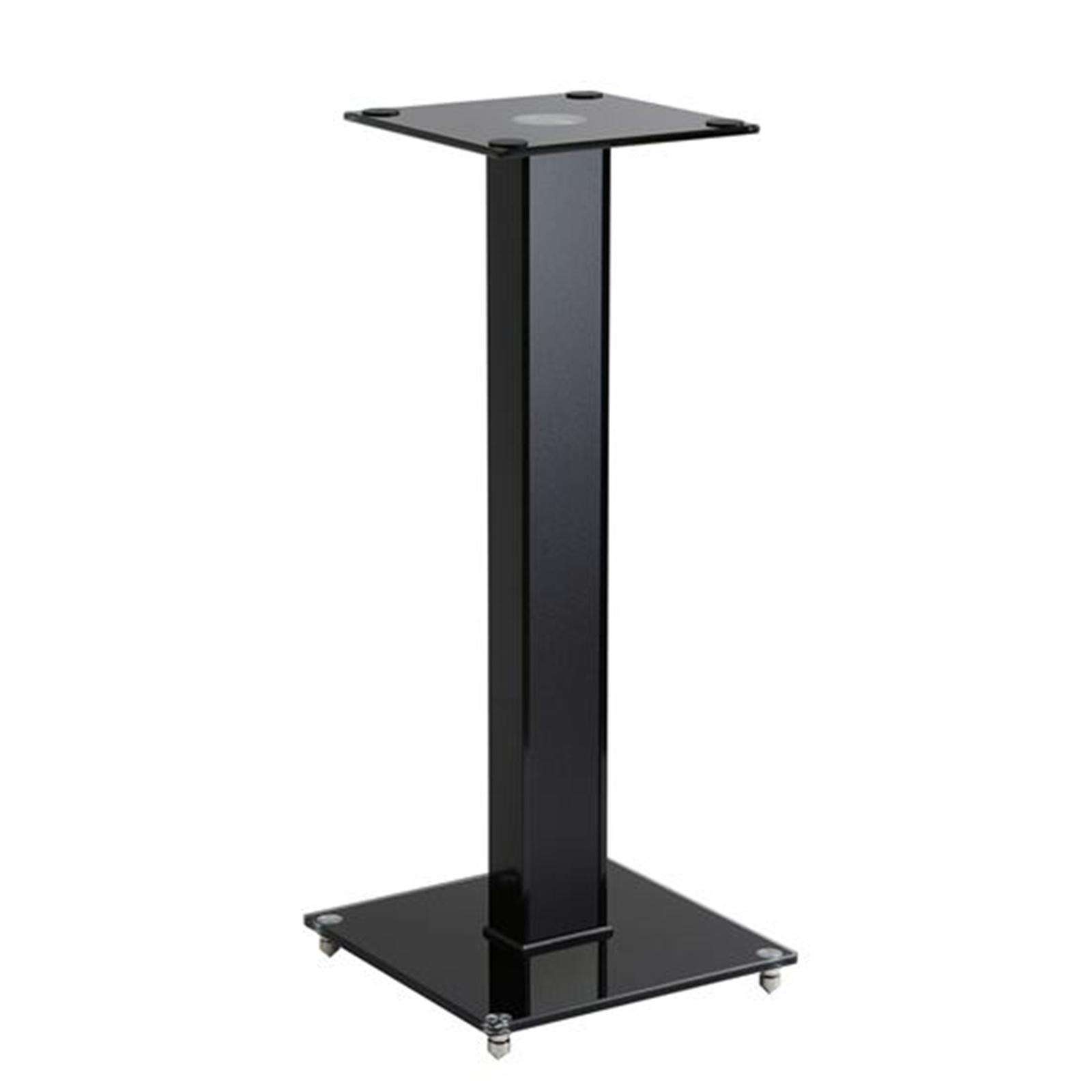 The BS-03S is a 23.6"(600mm) speaker stand for bookshelf/centre-channel speakers up to 10kg/22 lbs. A solid aluminium pillar supports 250mm by 250mm glass plates at the top, a Tempered glass base with floor spikes adds stability, and a built-in concealed wire path hides speaker cables for a clean and organized appearance in any room.