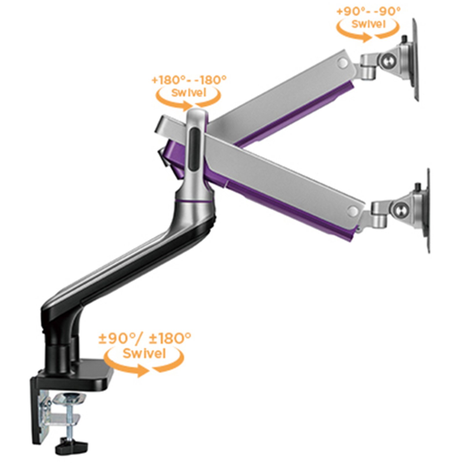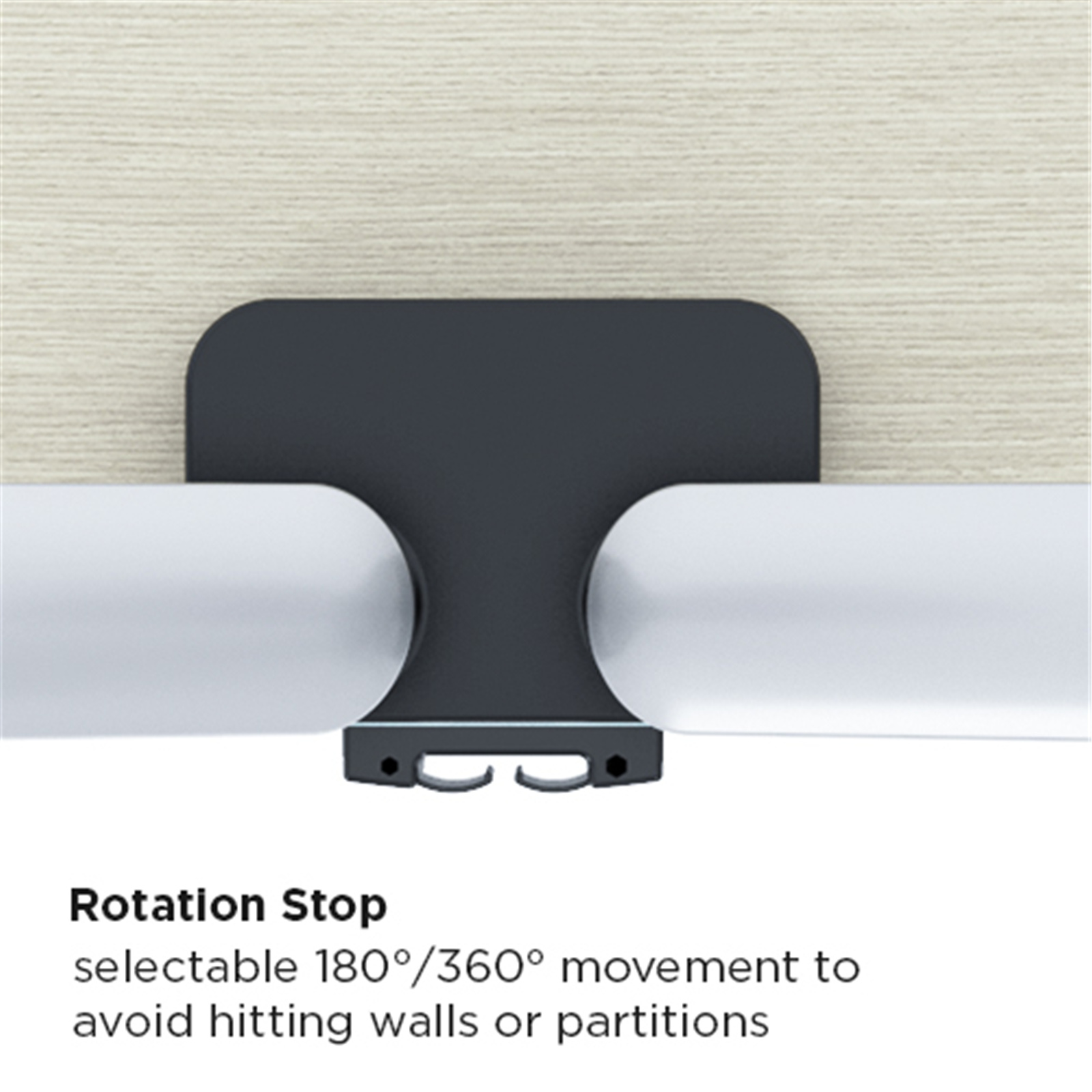 - 180° Rotation Stop: prevents monitor arm from swinging into screens or walls