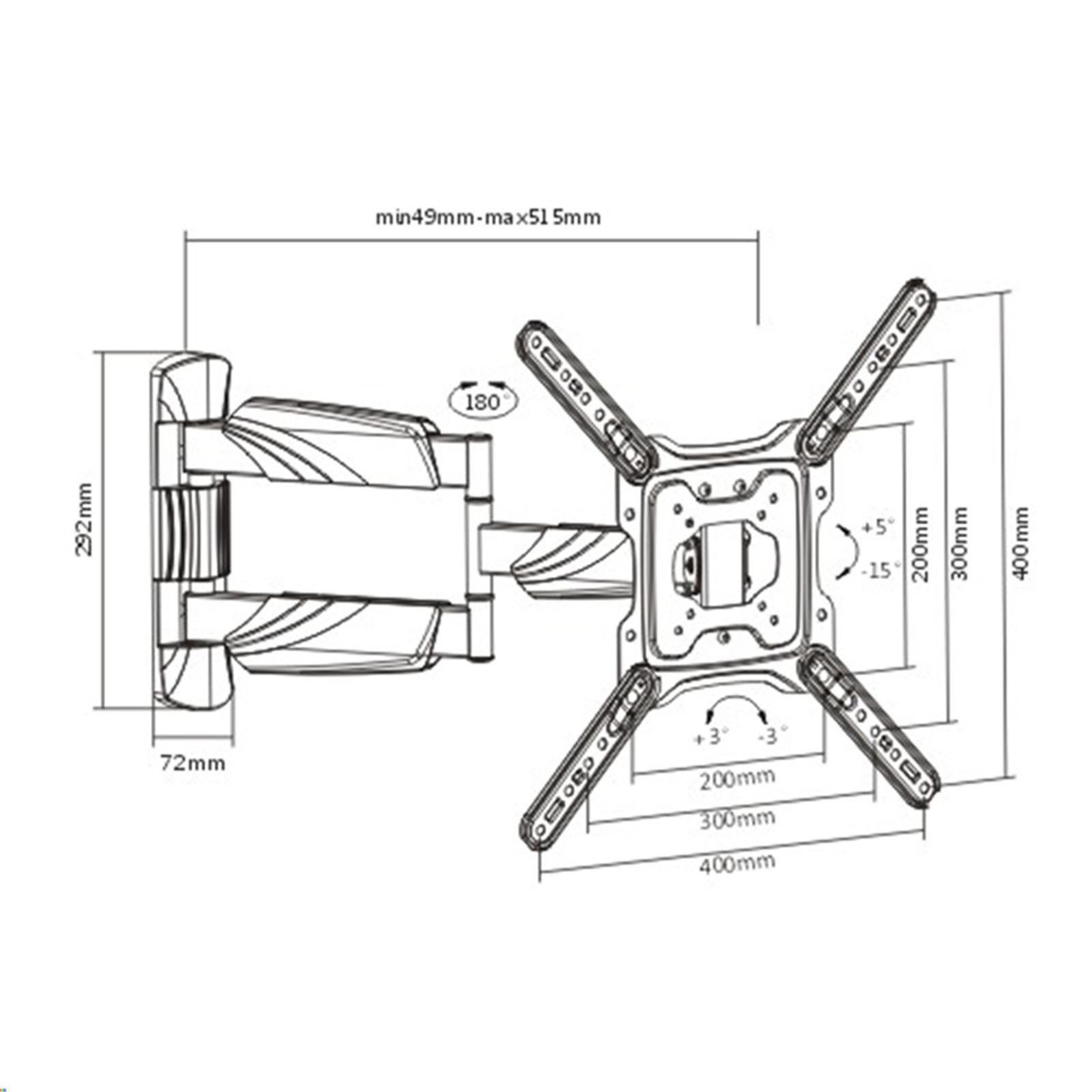 BRATECK 23-55" Full Montion TV Wall Mount. Tilt +5°~-15°, Swivel +90°~-90°. Built-in level adjustment. Integrated cable management. Profile 49-515mm. Max VESA 400x400mm.