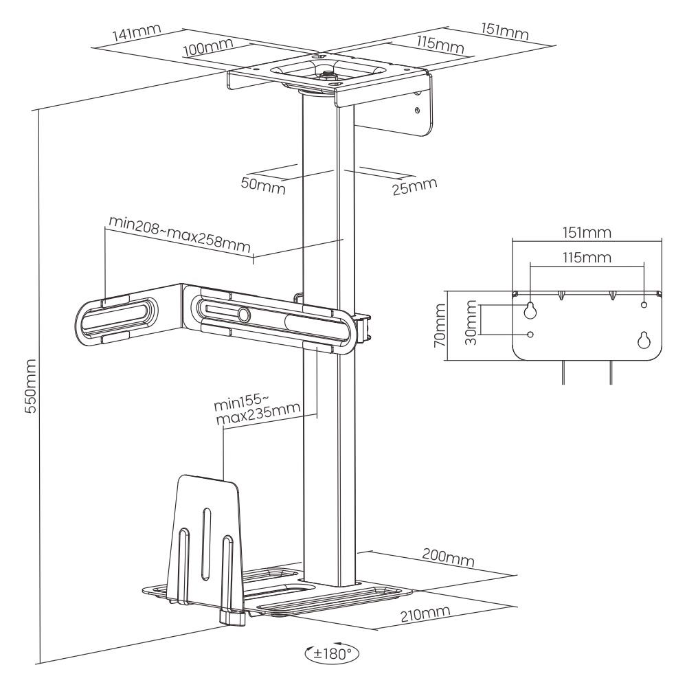 Brateck Multifunctional Under-Desk Wall Adjustable CPU Holder. 360 Swivel, Supports up to 30Kgs, Matte Black
