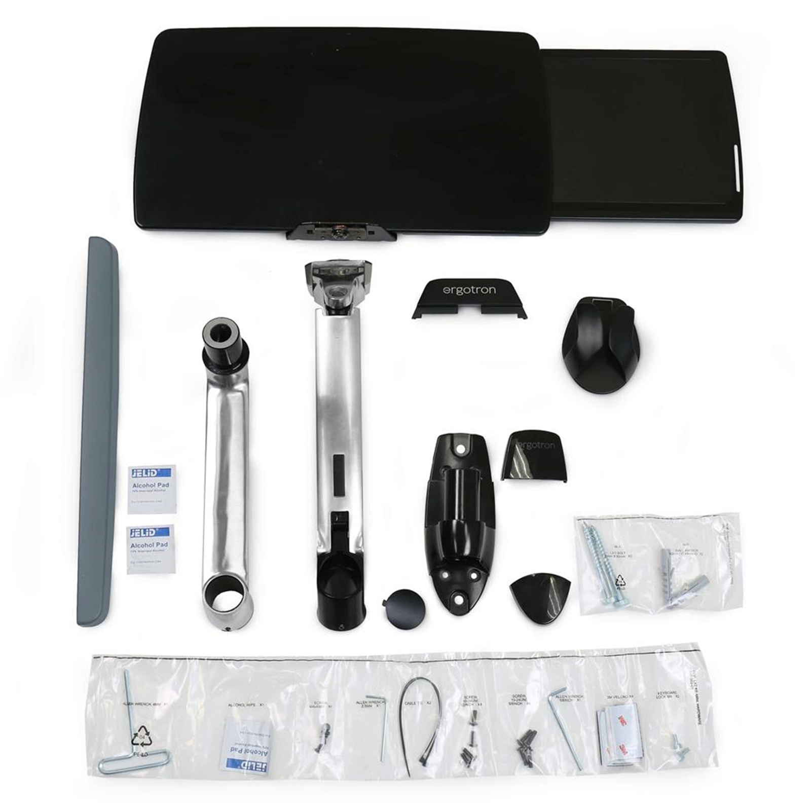 - Includes LX arm, extension, keyboard tray, mouse tray, wall mount base, fasteners for wood stud or concrete wall, mouse holder, wrist rest