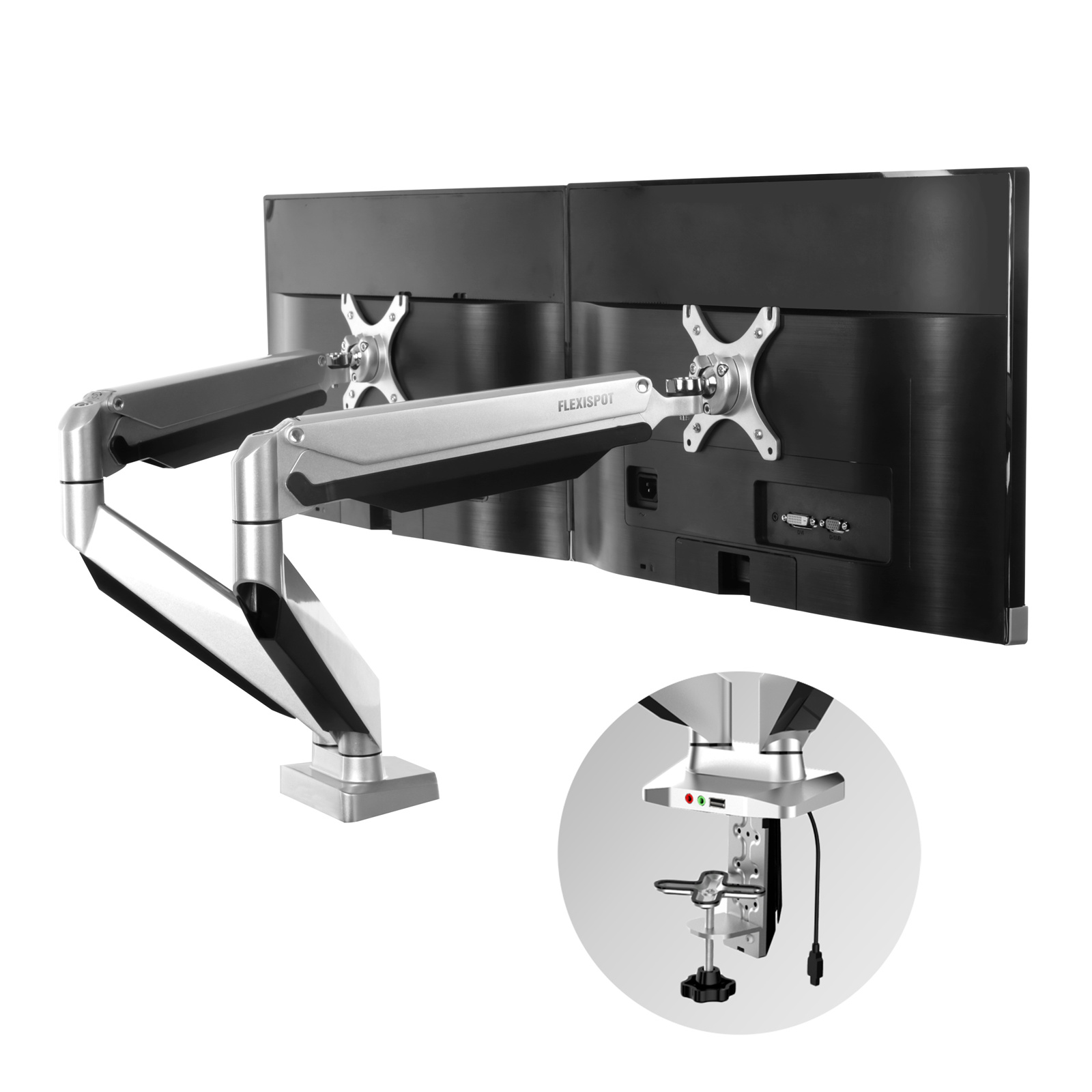 FlexiSpot D7D Aluminum Gas Spring Dual-Monitor Arm with USB Port Made from extremely strong aircraft-grade aluminum, the D7D can support two 30" monitors weighing up to 9KG. But it will swing effortlessly away if you need to move the monitor to the side to accommodate an impromptu meeting at your desk! The D7D features a built-in USB port, a microphone jack, and a headphone jack in the base. Easily Charge your phone, listen to your tunes, or join a conference call with this convenient feature.