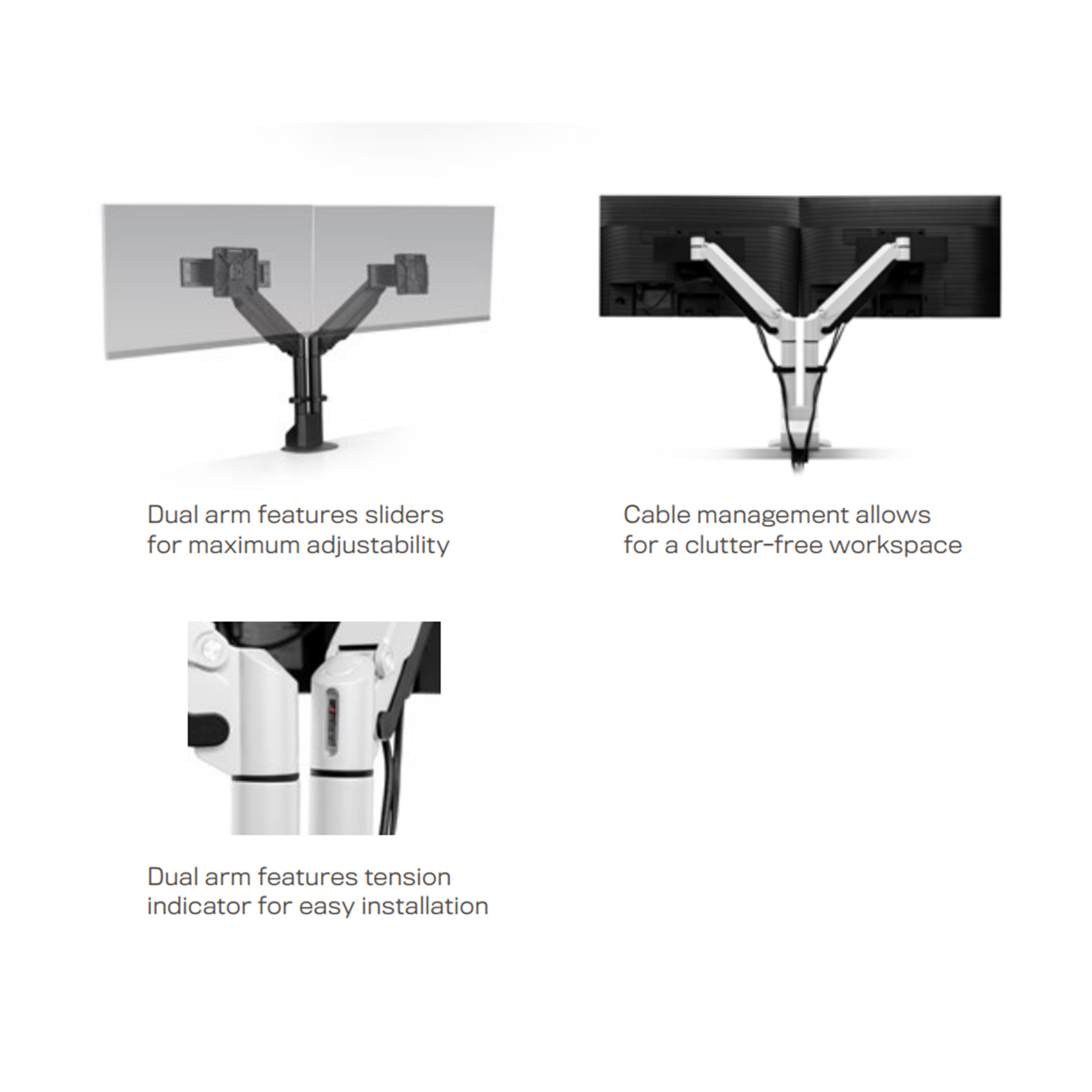 With a fast and easy install, quick release tilter and featured sliders on the dual arm, the E2 proves to be the ideal monitor arm for both home and office environments.