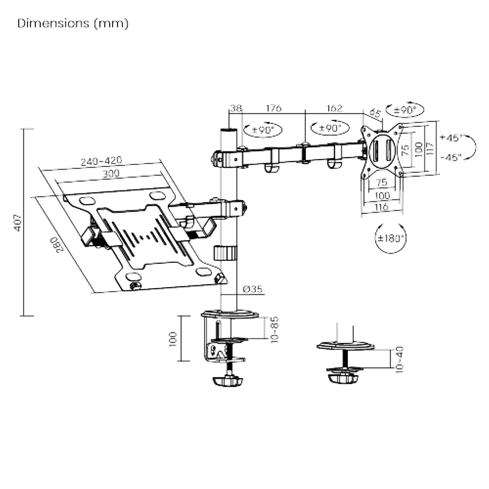 For people who work with both monitors and laptops, the KN-DTF624ML is the perfect choice. It allows for independent adjustment of each monitor and provides optimal viewing angle by positioning two screens at the same level. The durable steel structure accommodates 17"-32" monitors up to 9kg(19.8lbs) and 10"-15.6" laptops up to 4kg(8.8lbs). The monitor arm incorporates a detachable VESA plate for user-friendly installation and cable clips for clutter-free workplace.