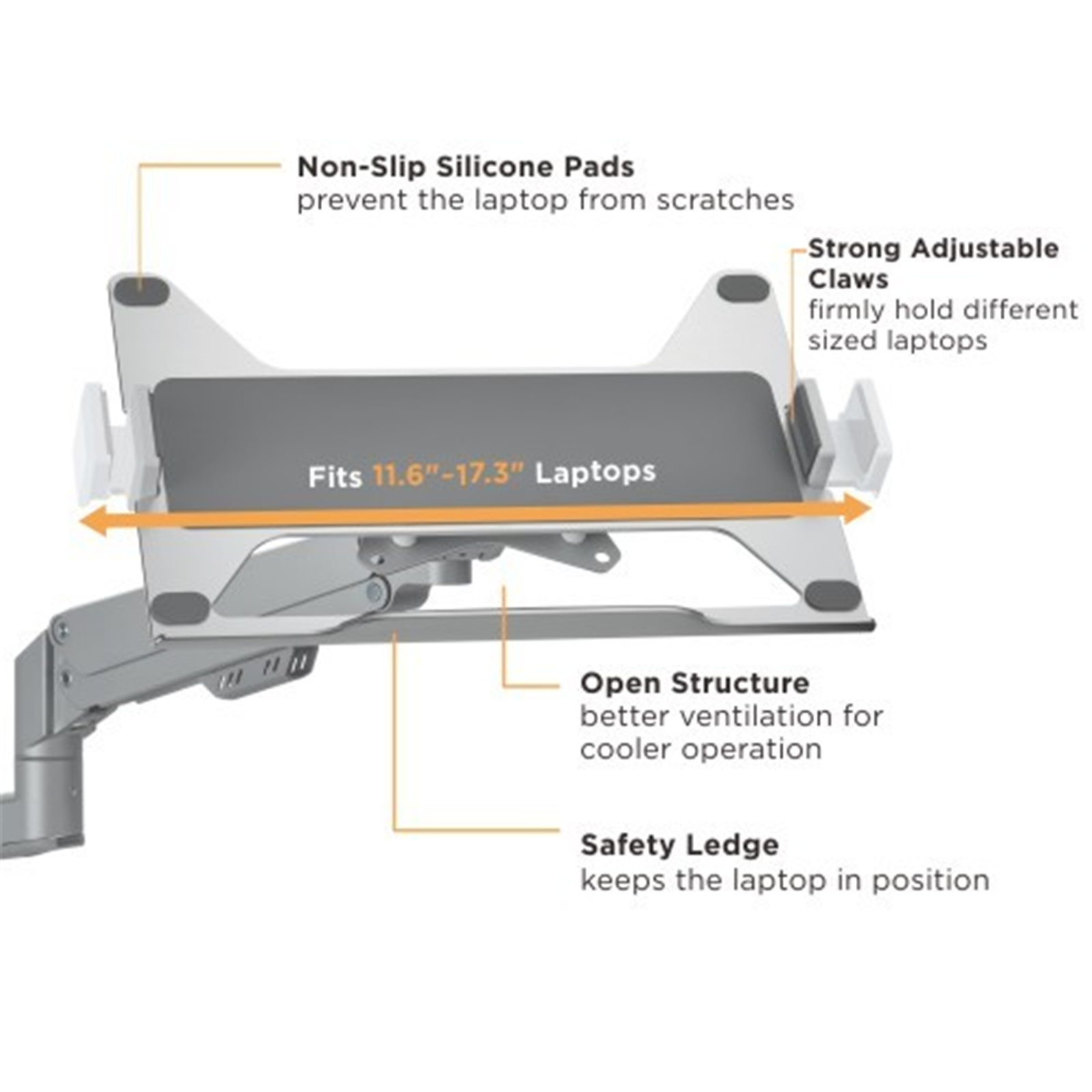 KONIC Universal Aluminium Notebook Holder Only - accessory for Konic Monitor Arm Stand - Silver - Fits for 11.6"-17.3" Laptops