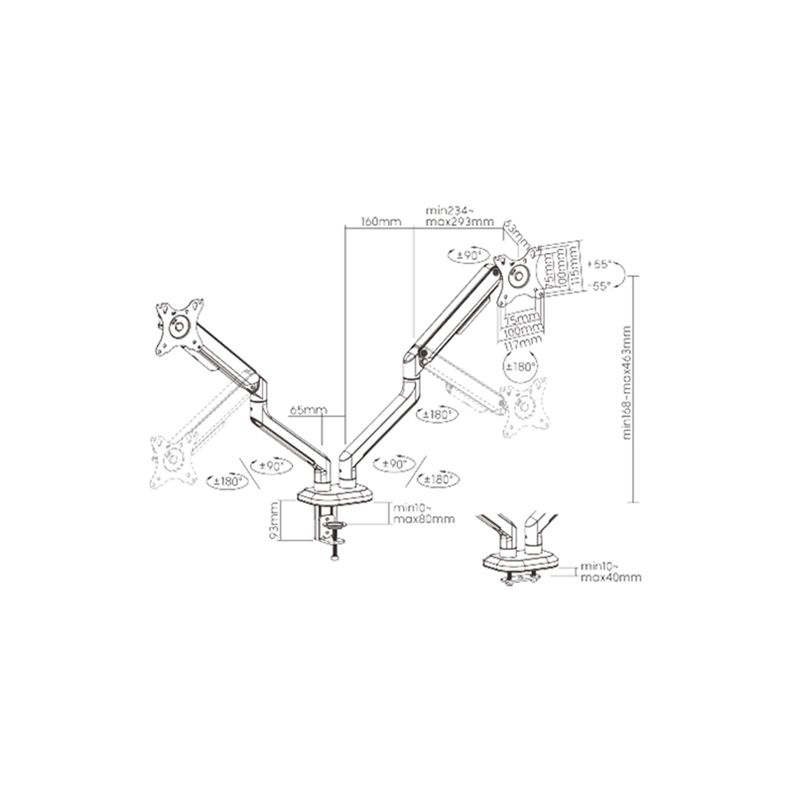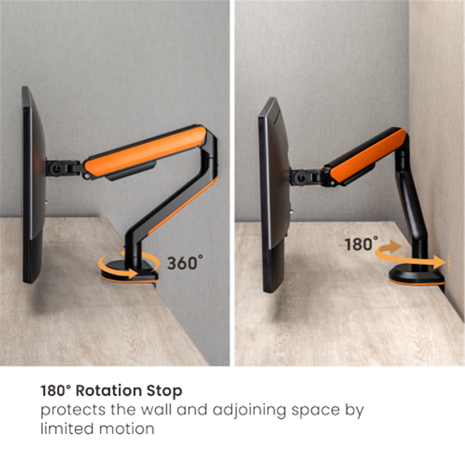 - 180 ° Rotation Stop: prevents monitor arm from swinging into screens or walls