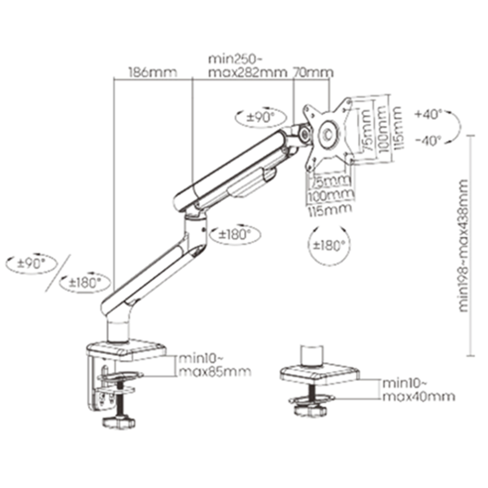 - Integrated 180 ° Rotation Stop: prevents monitor arm from swinging into screens or walls