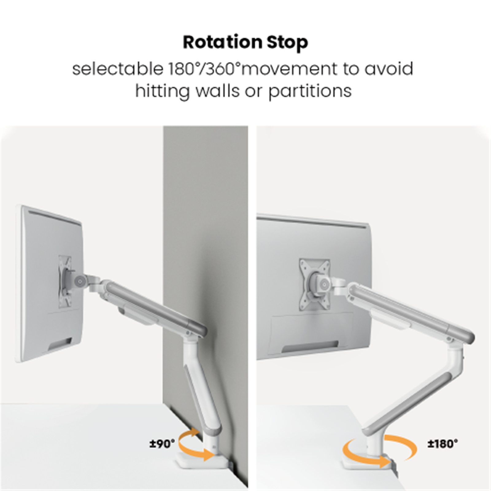 - 180 ° Rotation Stop: prevents monitor arm from swinging into screens or walls