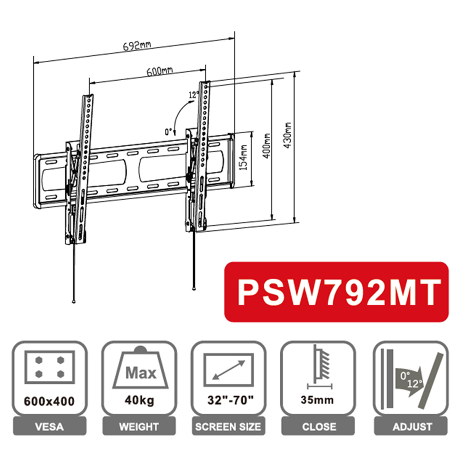 This Low-Profile Tilting TV Wall Mount attaches nearly flush to the wall to maximize the sleek, thinness of LED TVs which make TVs like a picture hanging on the wall. It can hold a TV with both flat and curved screen between 32" and 70" with max 600*400 VESA compatibility and max. 40 kg loading capacity.