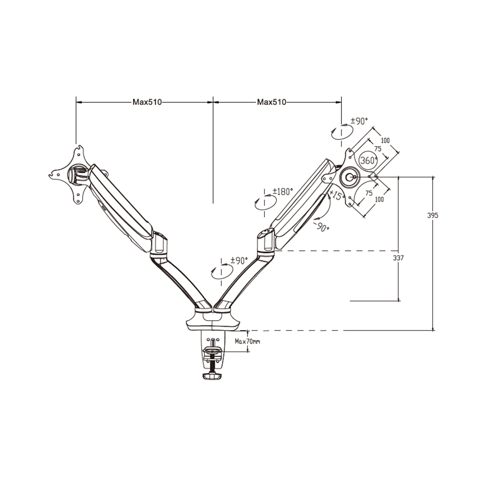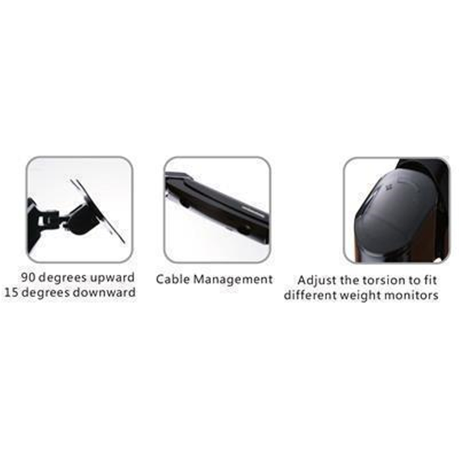 Full rotation, 360 degrees at any position. Up to 30 inch monitor. 80 degrees upward, 20 degrees downward. Double arms for two monitors.