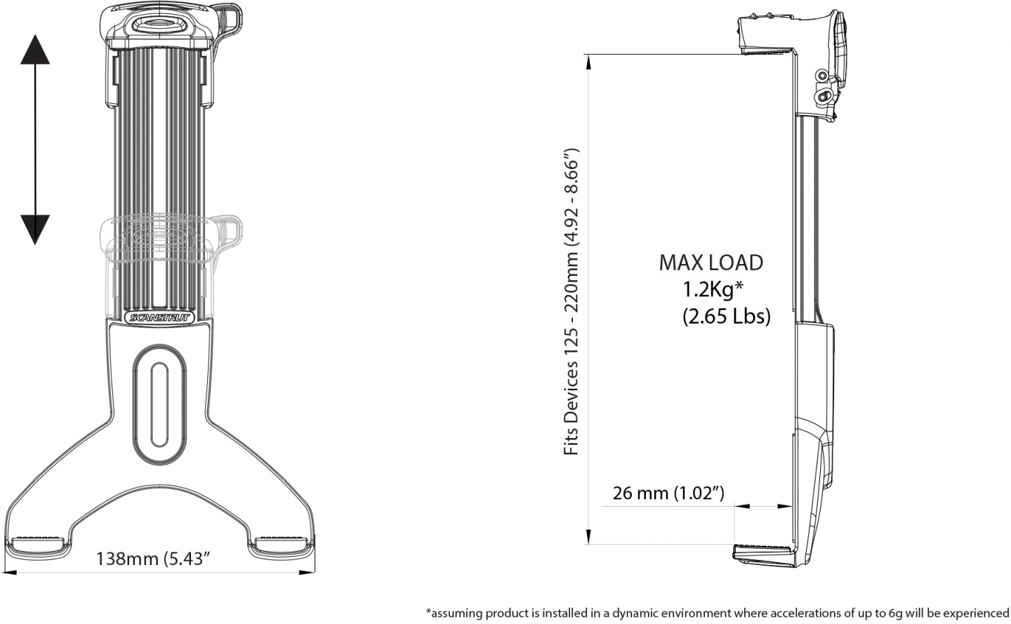 Secure mount for mini and full size tablets - ratchet adjustable. Fits devices from 125mm to 220mm (5 - 8 1/4")