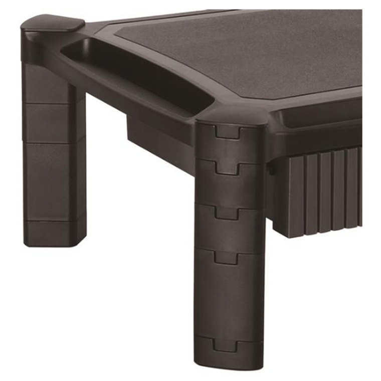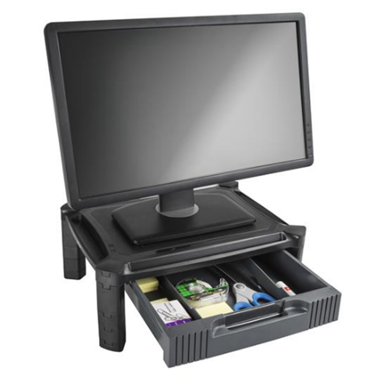 Raise your monitor to eye level for more comfortable viewing, while saving desktop space. You can set this sturdy height-adjustable monitor stand on your desk or table, to support a monitor up to 32" in size and up to 22 lb. (10 kg) in weight. It features stackable columns that sit neatly on your desk or table, leaving enough space under your monitor to fit a small laptop. It even has a drawer to hold office supplies.