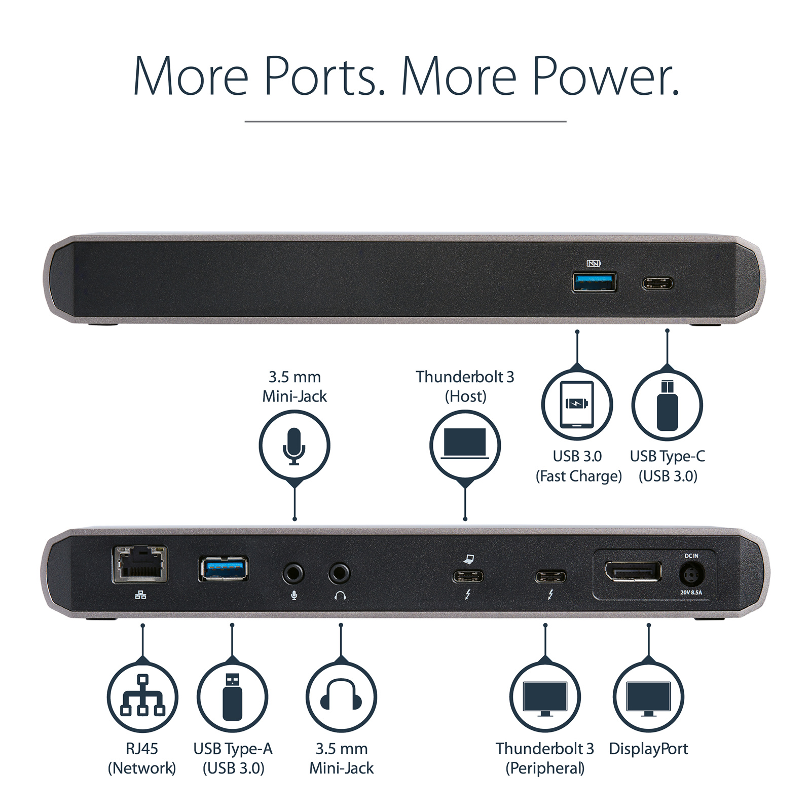 StarTech.com Thunderbolt 3 Daul 4K Docking Station with 85W Power Delivery 1x DP - 2x Thunderbolt 3 - 2x USB 3.0 - 1x RJ45 - 1x 3.55mm Audio-in - 1x 3.5mm Audio-out - Supports Apple MacOS / Microsoft Windows - 3Y Warranty
