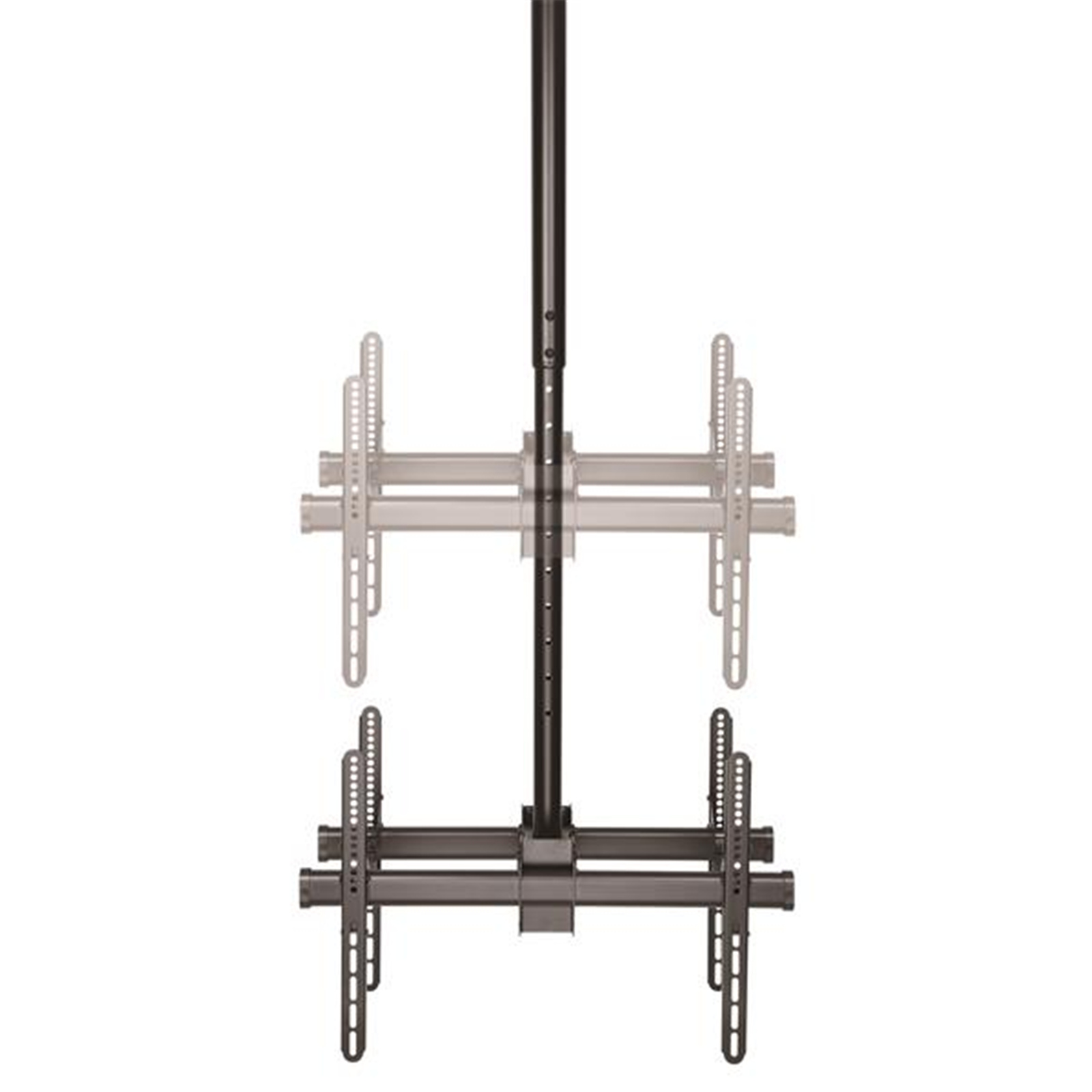 With a telescopic pole, the ceiling TV mount lets you suspend two displays at your desired distance from the ceiling, working with a range of ceiling heights. The pole-mount TV bracket can extend from 41.7" to 61.4" (1060 to 1560 mm), with a total lift (height extension) of 19.7" (500 mm).