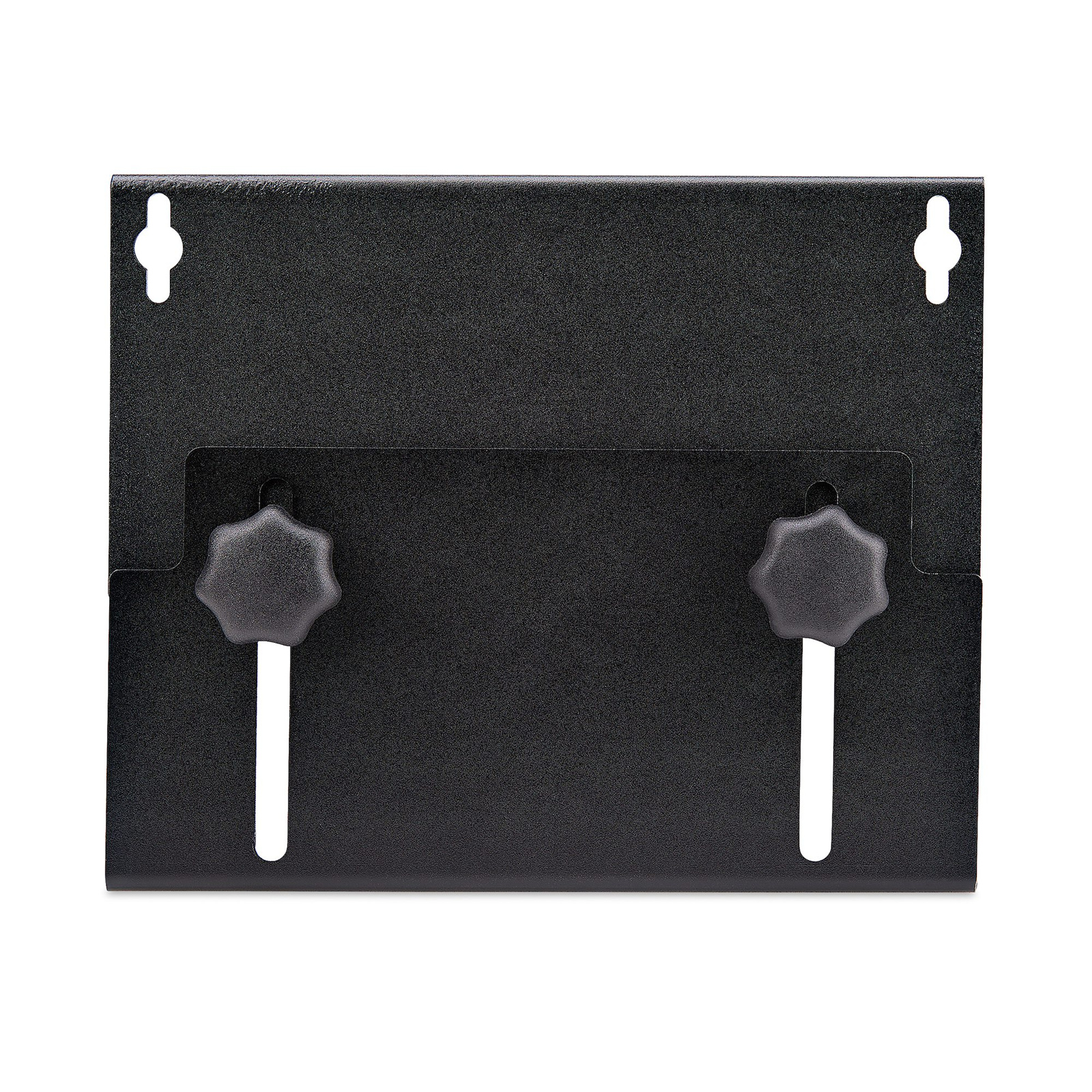 Quickly adjust the width of the PC wall mount bracket using the knobs. Included spacers protect the chassis and ensure a snug fit. The spacers allow different CPU sizes ranging from 1.9 to 7.8 inches (50 to 200 mm) up to Small Form Factor (SFF) computers.