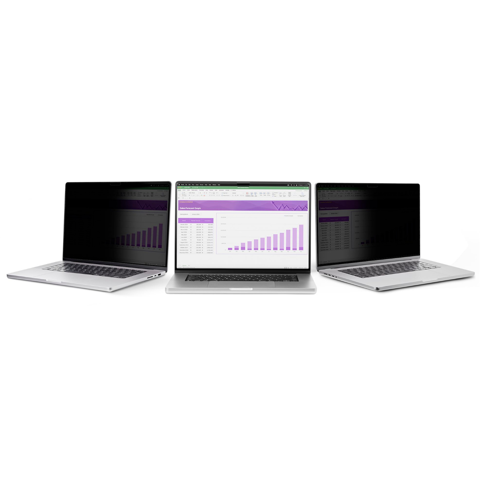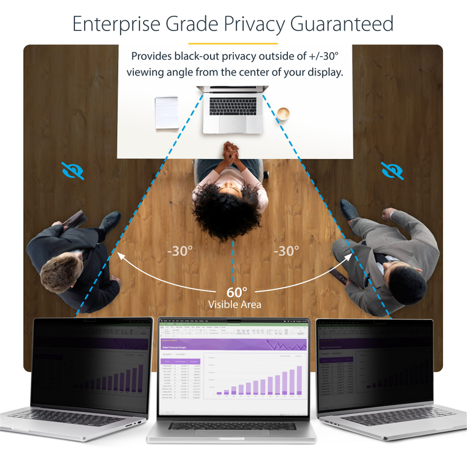This privacy filter is a convenient and cost-effective solution to protect confidential data from unwanted viewers. The privacy shield darkens your computer's screen from the side while providing a clear viewing angle of 60 degrees (+/- 30 degrees from center) to the user.