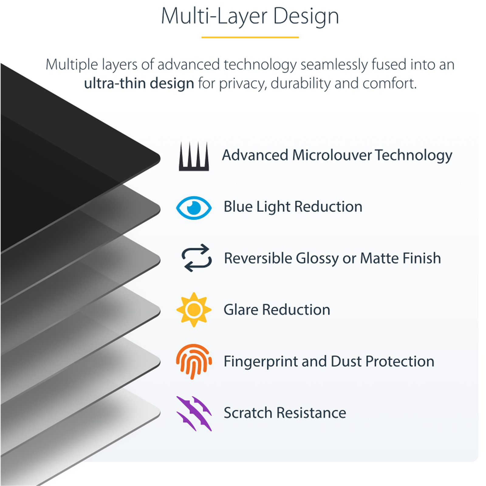 - REVERSIBLE FILTER: Privacy filter features an anti-glare matte side for environments prone to glare and a high-gloss side that helps retain color vibrancy; Matte side provides extra screen protection with a scratch and fingerprint-resistant coating