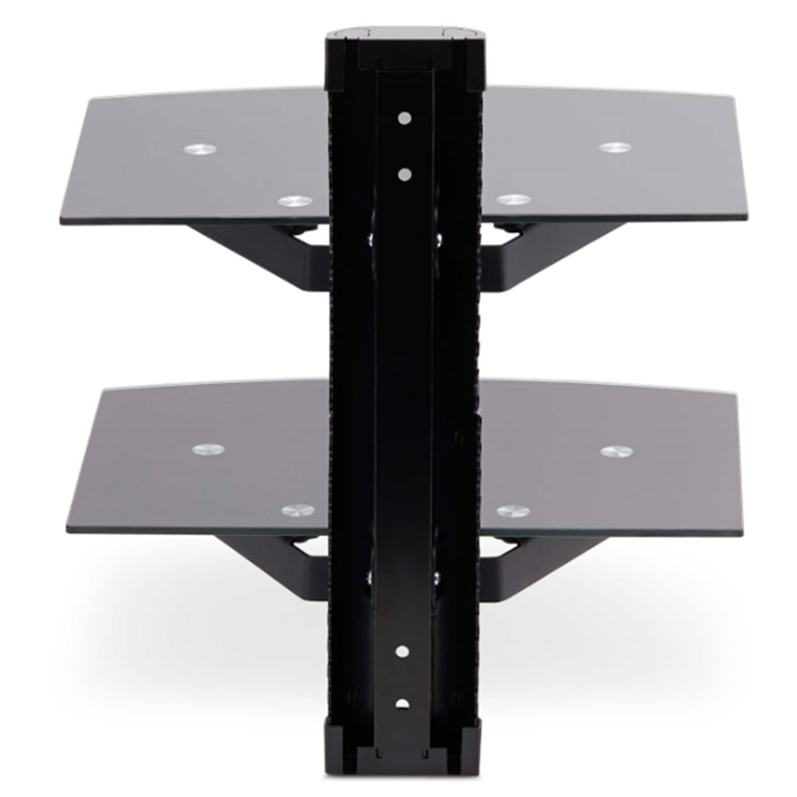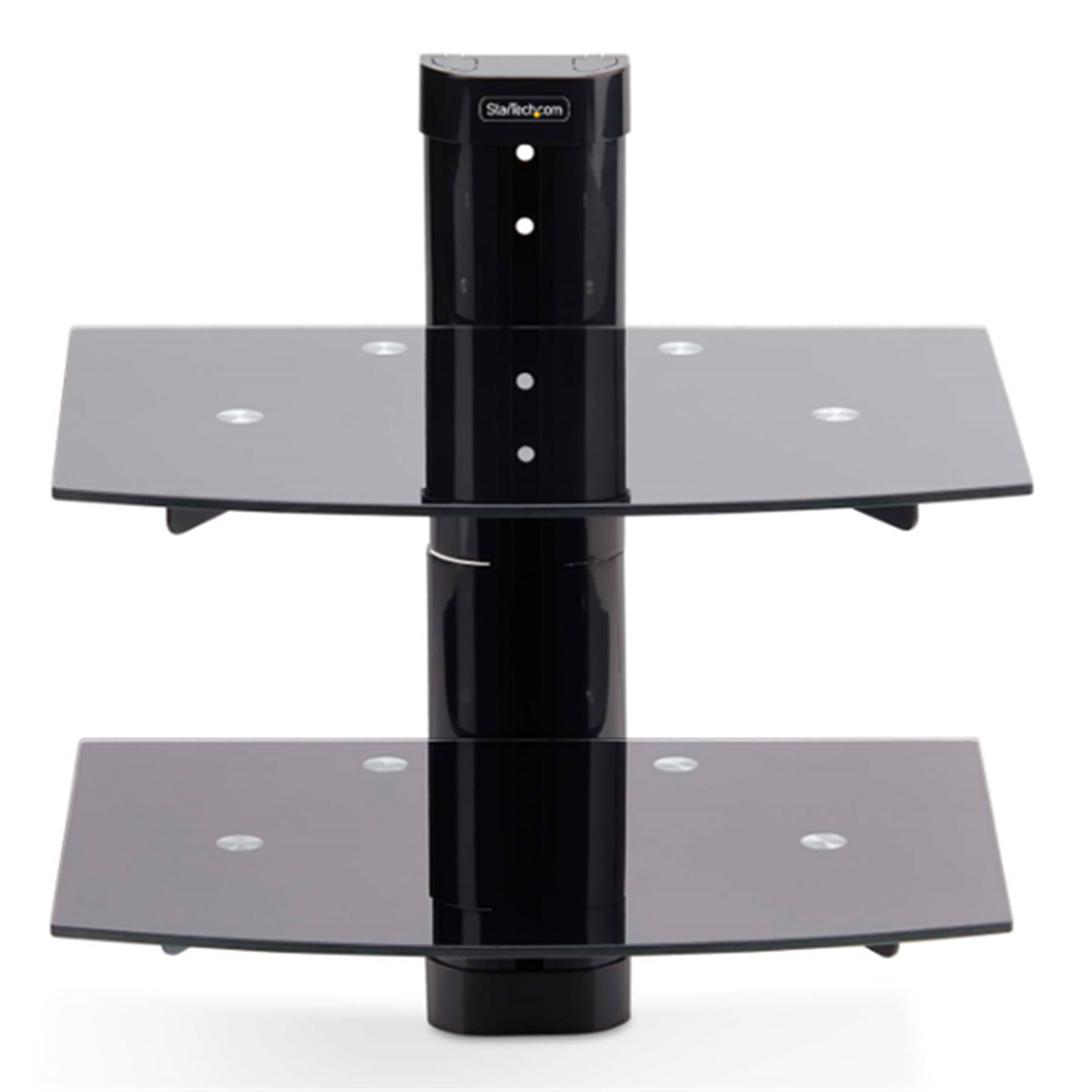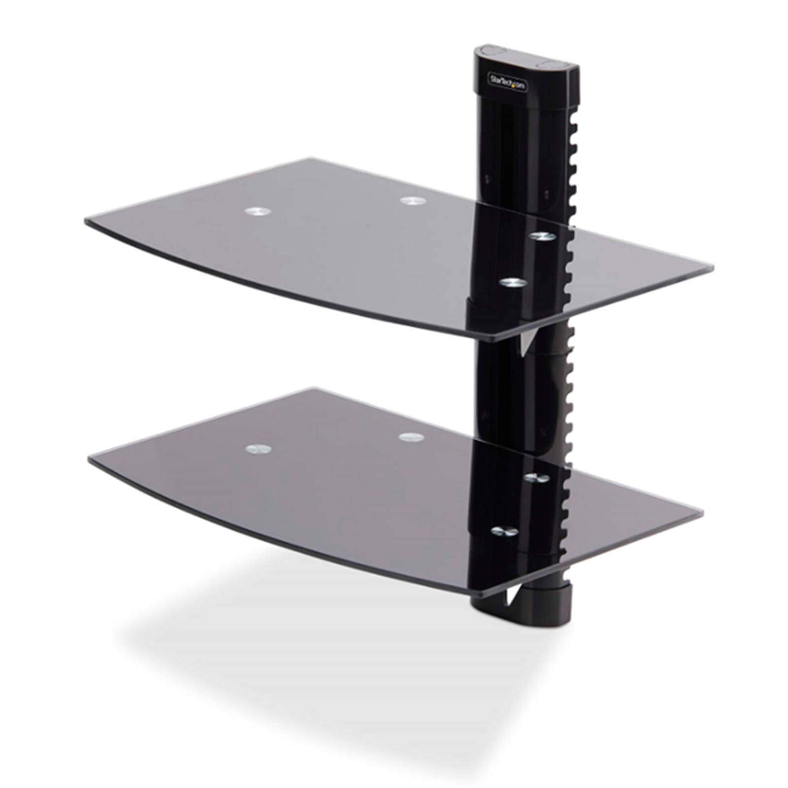 The shelves are height adjustable along the 13.6-inch (346mm) wall mount bracket, allowing for customization to accommodate various AV equipment sizes and configurations, such as video conferencing equipment or an AV receiver.
