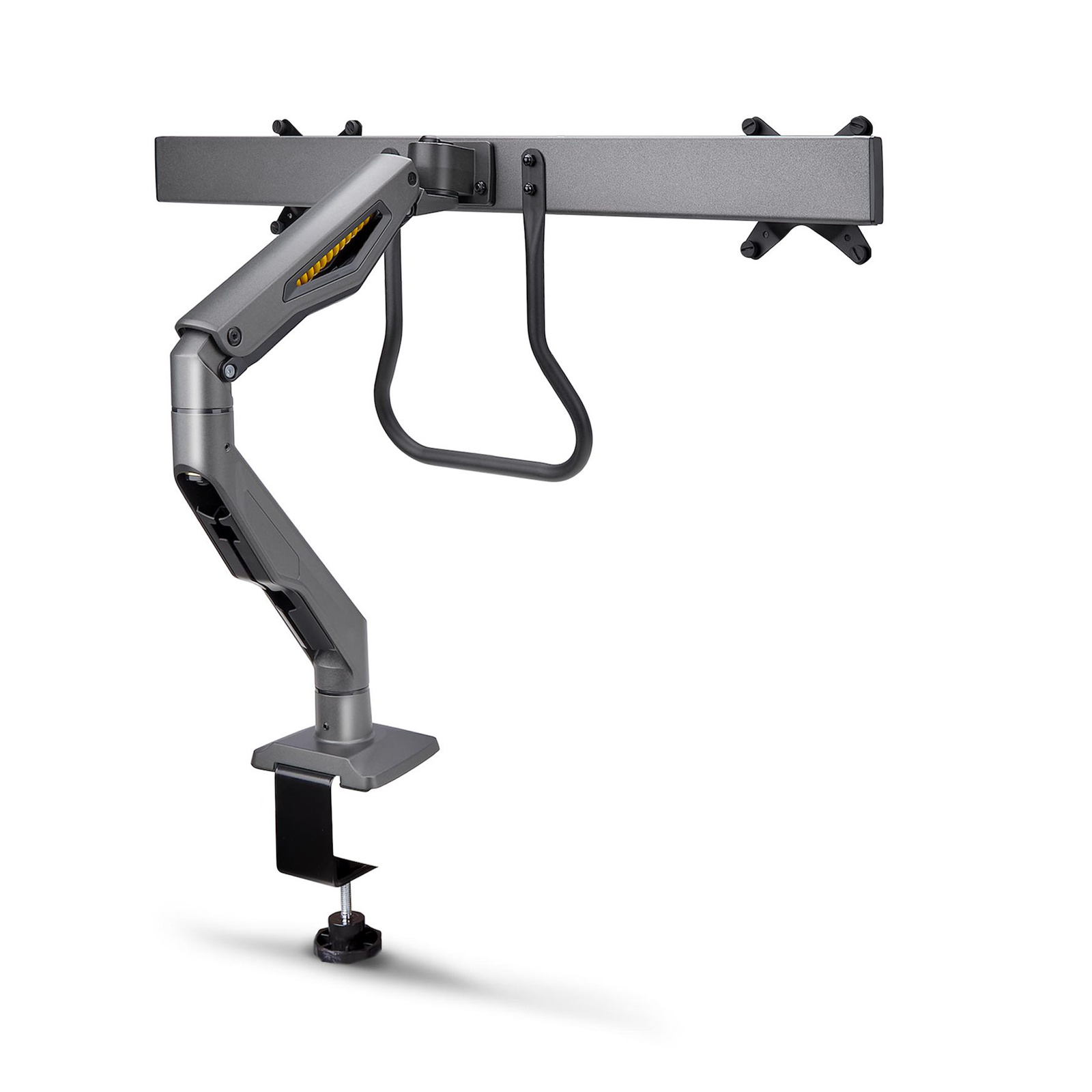 This crossbar monitor desk mount is designed to support up to two 27-inch displays, creating an ergonomic multi-monitor setup that provides an extensive viewing area for productivity. The built-in handle enables moving all monitors simultaneously, while the spring-assisted arm enables multiple adjustments to suit different ergonomic needs.