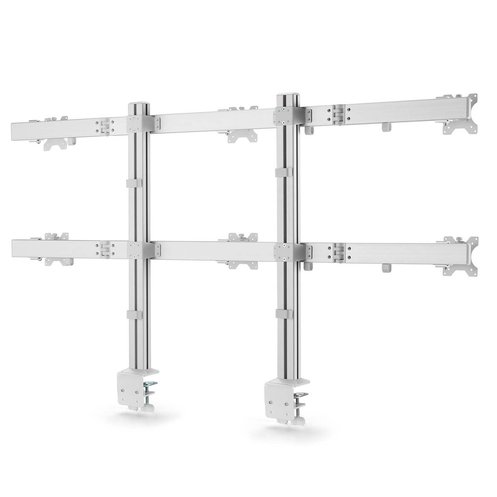 This monitor desk mount is designed to support up to six 32-inch displays, creating an ergonomic multi-monitor setup that provides a vast viewing area for productivity.