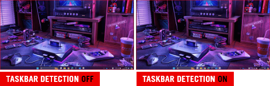 Dynamically detects the taskbar and reduces brightness around it to avoid burn-in.