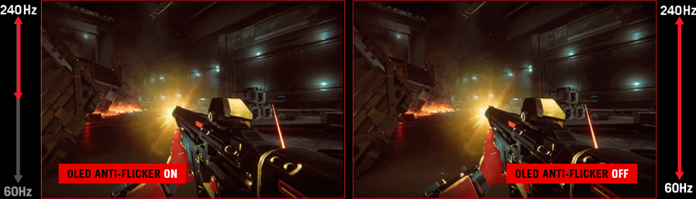 ROG-exclusive OLED Anti-Flicker technology offers three refresh rate ranges ― High, Mid, Off ― to reduce flicker during frame rate fluctuations and maintain an immersive gaming experience.