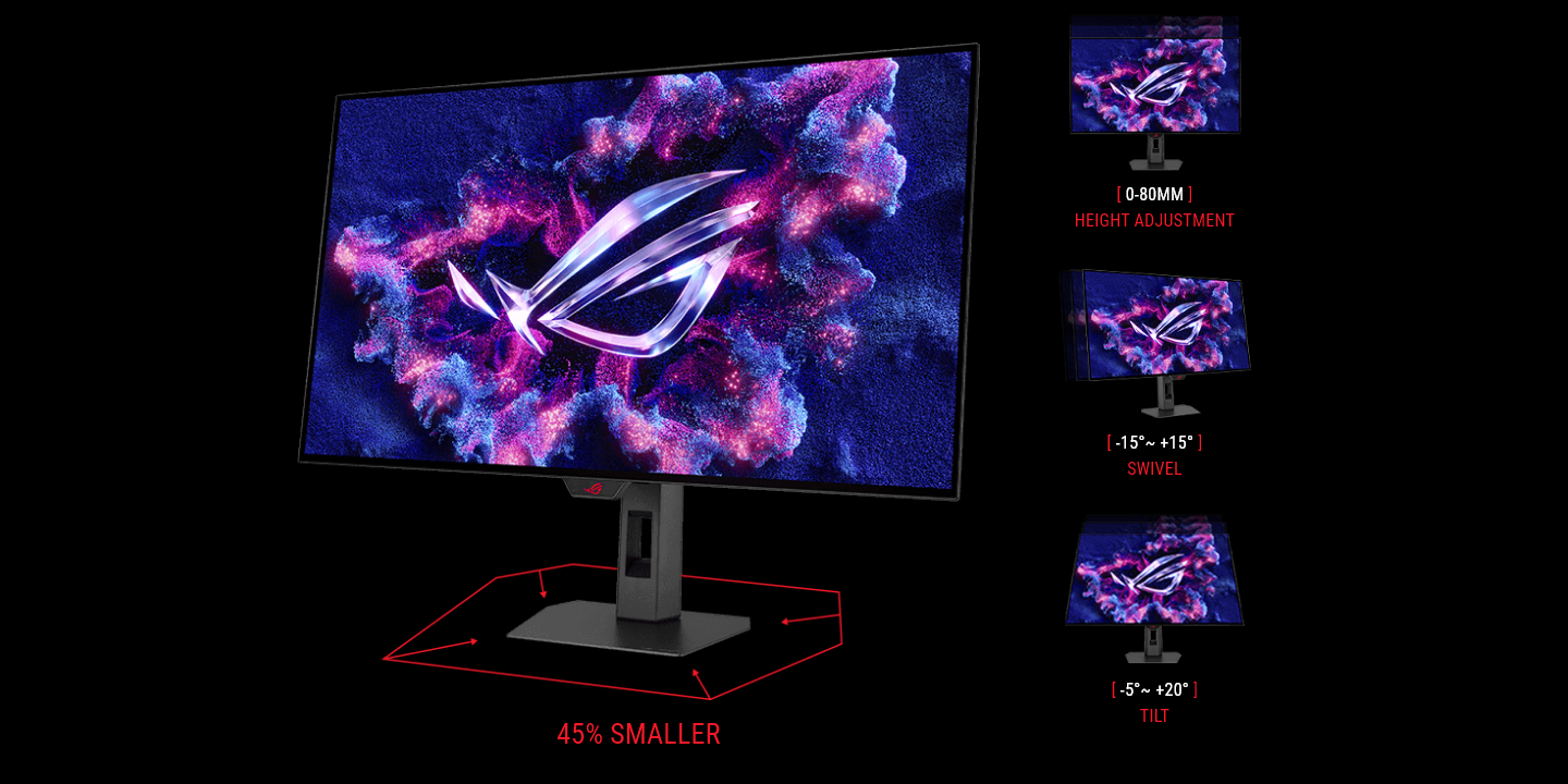 The new ROG Strix OLED series monitors feature a new compact stand that's 45% smaller than those found on previous-generation XG monitors, freeing up valuable desk space for a keyboard and mouse. The stand offers tilt, swivel, and height adjustments for the ideal viewing position. The display is also VESA wall-mount-compatible.