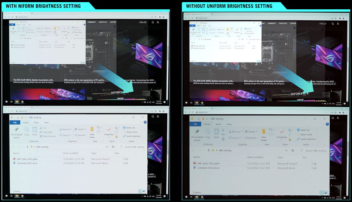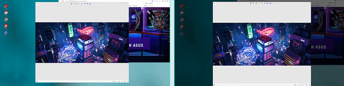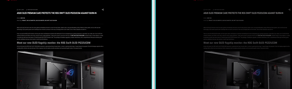 When activated, the ROG-exclusive Uniform Brightness* setting within the OSD menu decreases peak brightness to keep levels consistent for better viewing-even when changing the size of bright white windows. It also makes marathon gaming sessions much more comfortable on the eyes.