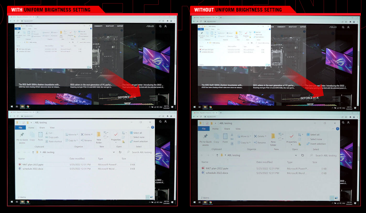 When activated, the ROG-exclusive Uniform Brightness setting within the OSD menu decreases peak brightness to keep levels consistent for better viewing, even when changing the size of bright white windows. It makes marathon gaming sessions more comfortable by reducing potential stress on the eyes due to extreme brightness shifts.