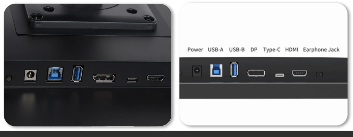 Standard HDMI *1, Standard DP*1, Type-C*1. USB-A (Output) *3, USB-B (Input) *1, DC Power (DC-005) *1, 3.5mm Earphone*1