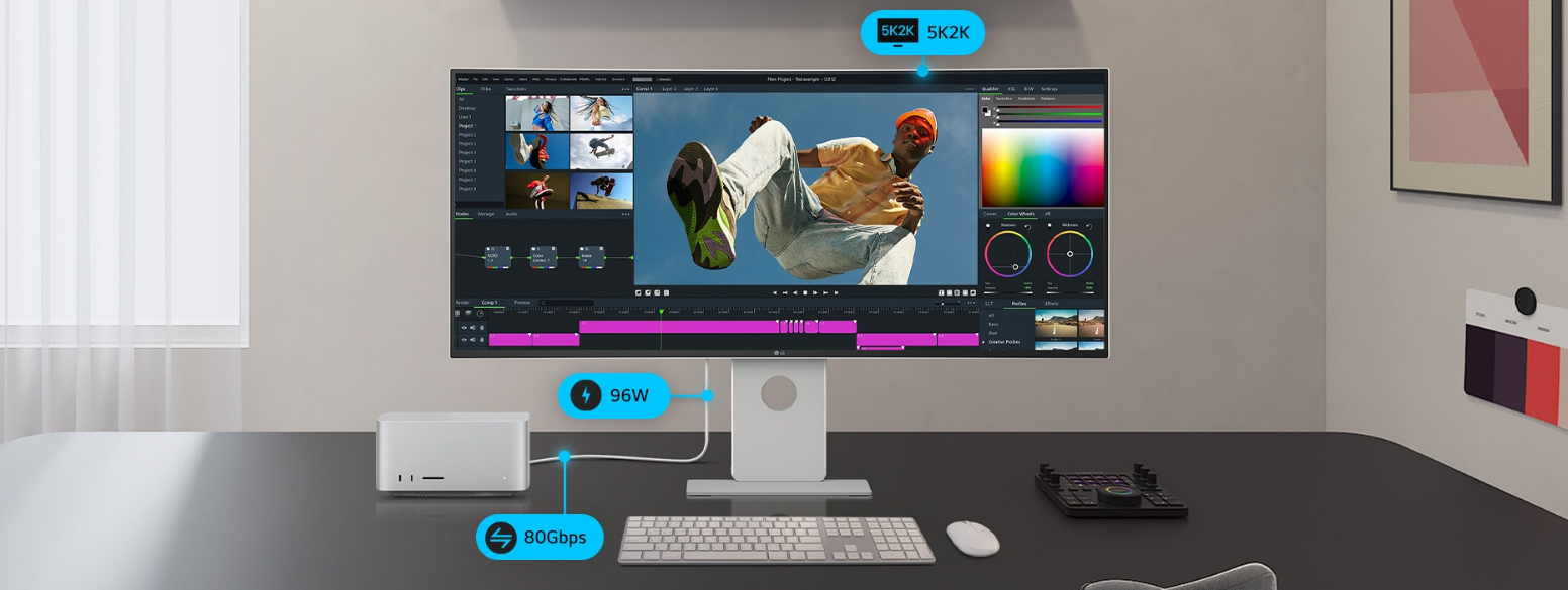 Thunderbolt™ 5 enables the production of commercial outputs such as documentary videos, movies, and game titles on an outstanding 5K2K display. It also offers data transfers that are twice as fast to connected devices compared to Thunderbolt™ 4 and allows for charging your laptop (up to 96W) through a single cable, ensuring stability, scalability, and security.