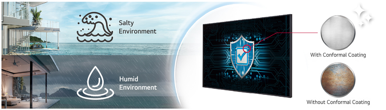 Optimized for business environments, the UH5Q is protected against salt, dust, iron powder and humidity thanks to conformal partial coating on power board, allowing for stable operation. Also, its customer-centric features, such as IP5x and Shock Monitoring*, provide both reliability and satisfaction, ensuring the durability of LG UHD signage.