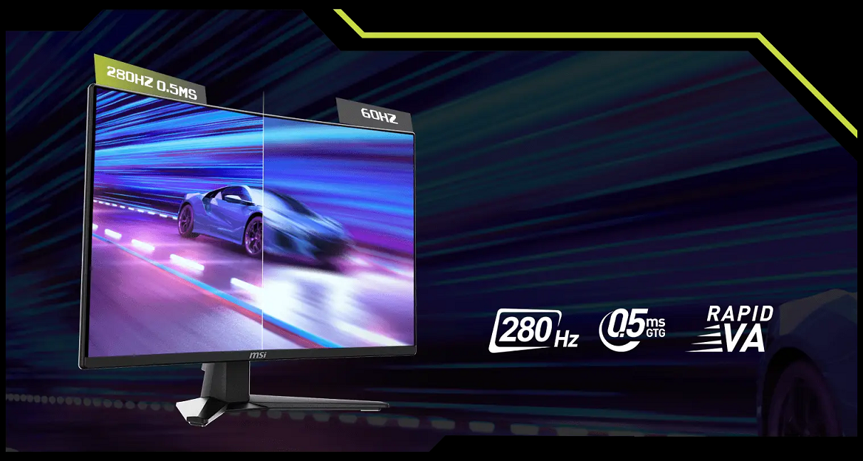Equipped with a 280Hz refresh rate and 0.5ms (GtG, Min.) response time which has the benefit in fast moving game genres such as first person shooters, fighters, racing sims, real-time strategy, and sports.