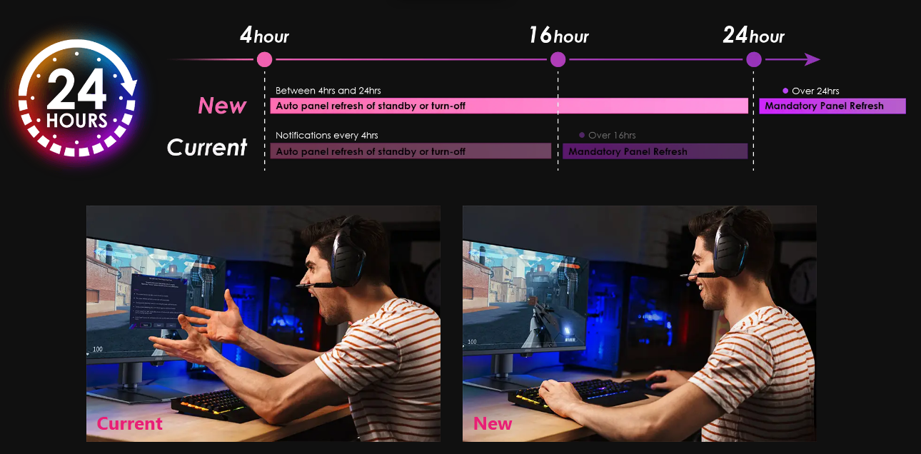 The panel refresh cycle has been extended from 16 to 24 hours, reducing interruptions during gameplay or work. Users will only see a reminder 30 minutes before the refresh, ensuring minimal disruption. The refresh still activates automatically when the monitor enters standby or powers off, maintaining full OLED protection without compromising your experience.