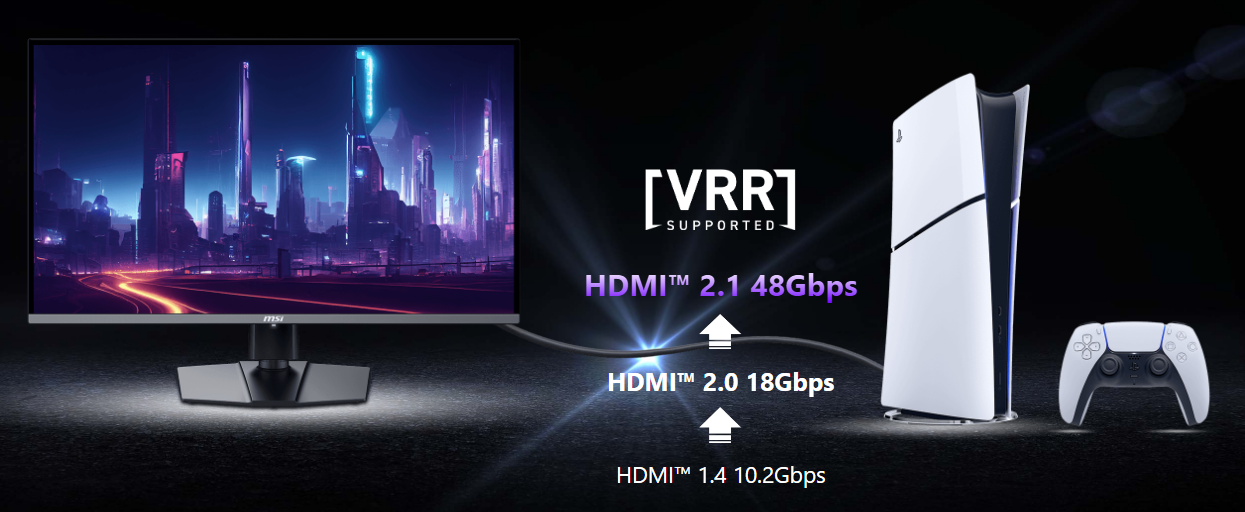 HDMI™ 2.1 provides full bandwidth up to 48Gbps, supporting VRR and ALLM for a smoother, low-latency console gaming experience at up to 120Hz. With built-in HDMI™ CEC (Consumer Electronics Control) technology, the monitor can communicate with controllers, allowing them to wake the monitor and adjust modes tailored to different devices.