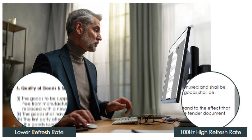 Attend the smoothest online conference call and show the perfect advertising video to customers with a 100Hz refresh rate. VESA's research shows that for 95% of users, 85Hz Refresh Rate has become a defacto standard for normal use that shows "flicker-free" images.