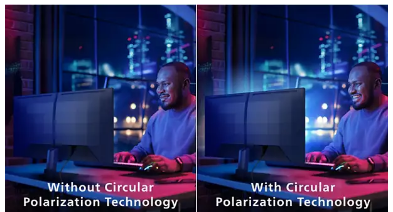 Circular Polarization uses natural light simulation to filter harmful blue light more effectively, reducing eye strain and fatigue. Unlike traditional screens, it activates more of the eye's natural defenses, offering a smoother, healthier viewing experience. For gamers, this means longer, more immersive play with less discomfort, with faster focus recovery, and reduced eye fatigue-ideal for intense sessions and peak performance.