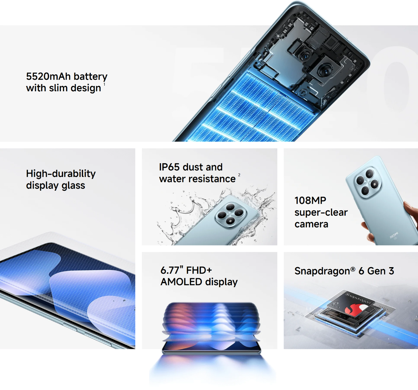 - 6.77" 120Hz FHD+ AMOLED Screen - Snapdragon 6 Gen 3 Chipset - IP66 Water Resistance - 108MP Super-clear Camera - 5520mAh Battery - 45W Turbo Charge
