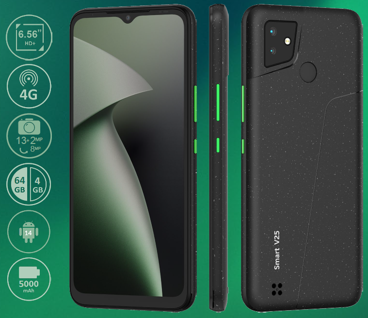 The Smart V25 embarks a 2.0GHz octa-core processor, 64GB ROM and 4GB RAM memory and a 13MP dual-camera, all powered with a 5000mAh battery chargeable through a USB-C port, providing a comfortable and smooth experience on the latest Android 14. Besides its unmatched features for its price, the Smart V25 is made out of 75% of recycled plastics and comes in an eco-friendly packaging to minimize its environmental impact.