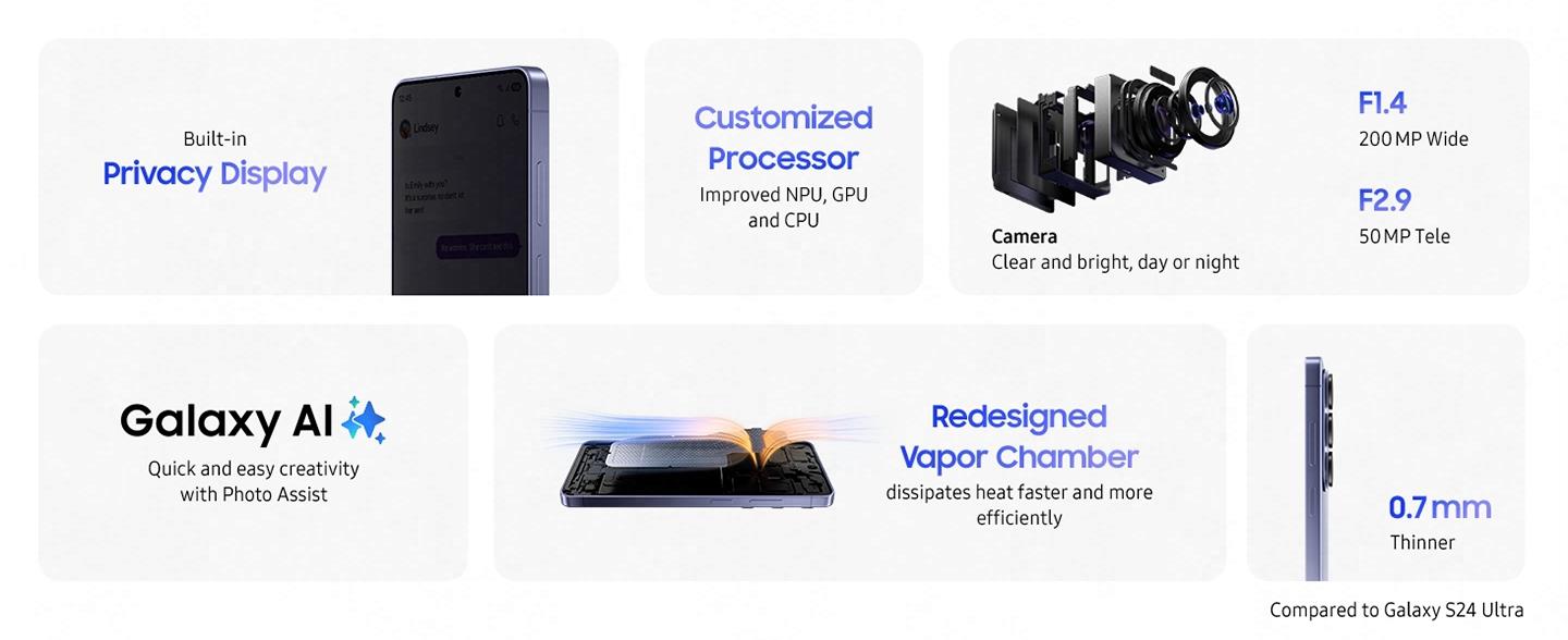 *Vapor Chamber performance improvements shown compared to Galaxy S25 Ultra. Actual performance will depend on user environment, conditions and pre-installed software and applications.