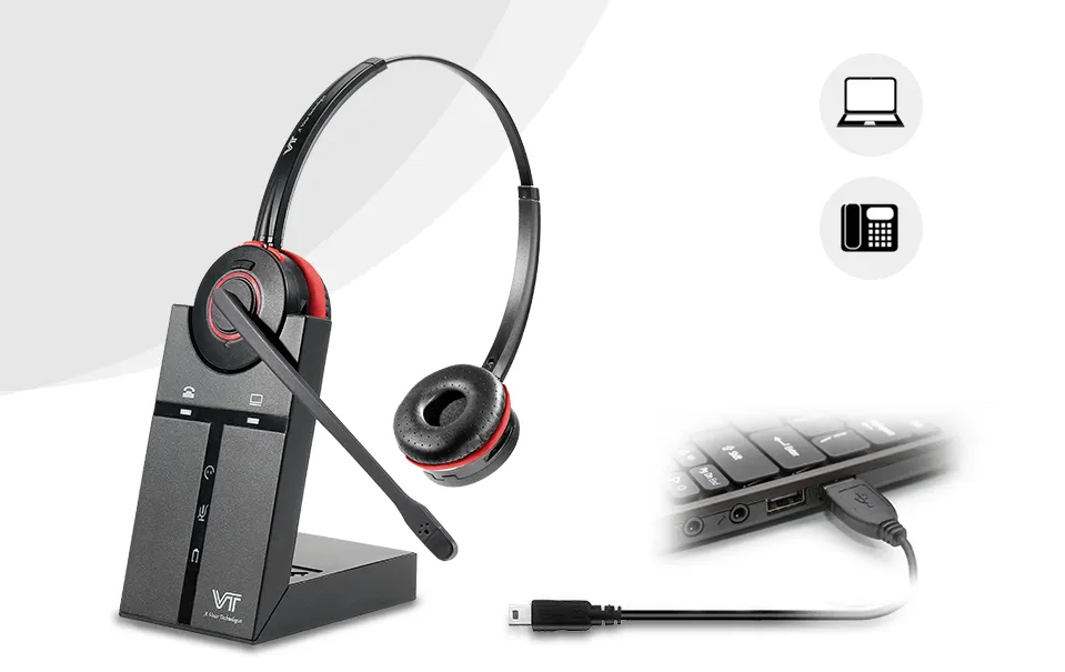 VT9400 Dect wireless headset allows you to roam or multi-task up to 120m/350ft from your PC or desk phone, truly keeps hands free, unleashes the potential of your talk-centric workforce.