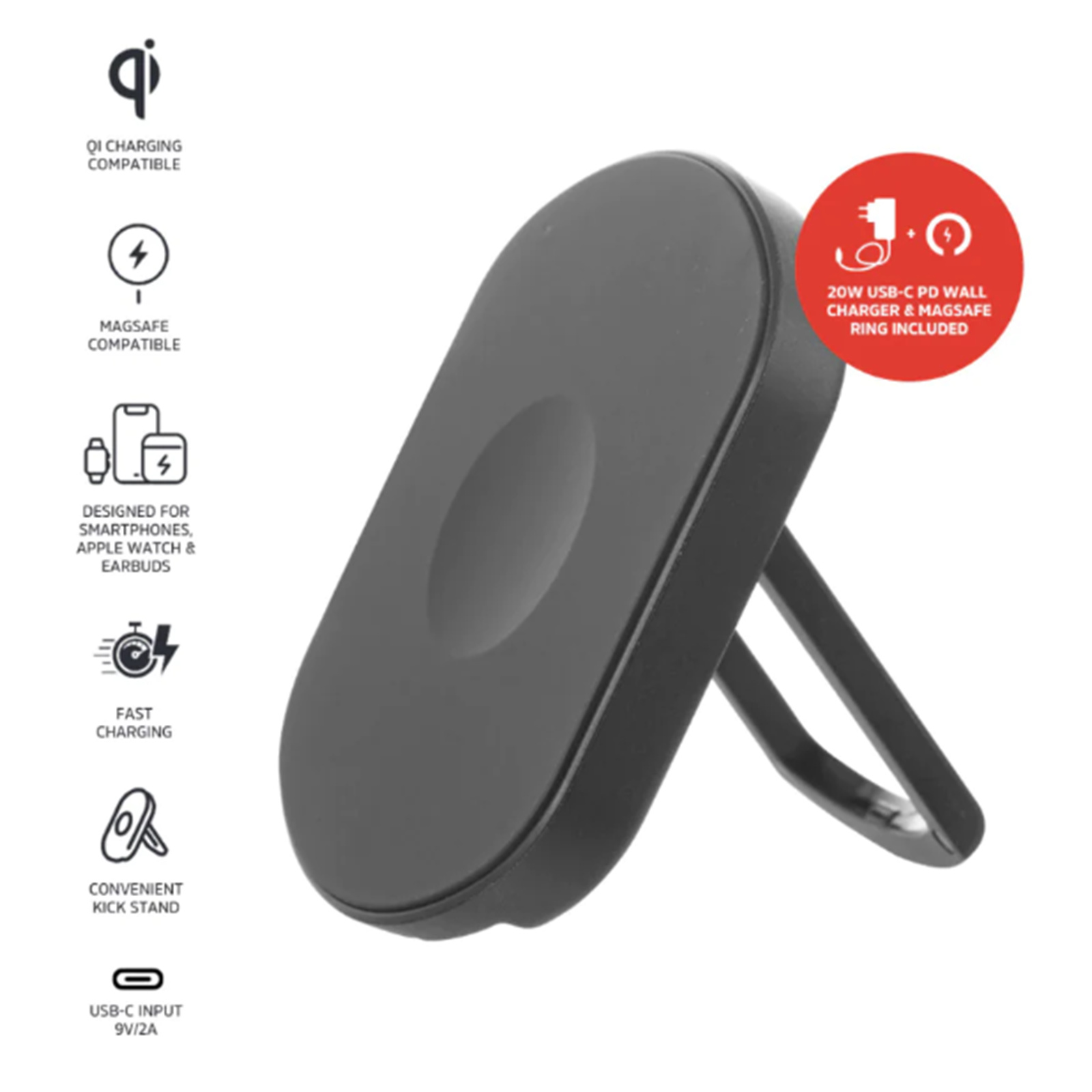 Lightweight and travel-friendly, this All In 1 Charging Stand and 20W Wall Charger bundle is the ultimate portable charging solution. Delivering fast and wireless charging of up to 15W for your smartphone, watch and earbuds with one simple product. Work and play as your device seamlessly aligns with the charging stand with magnetic precision, and maximise hands-free streaming via the convenient kickstand.