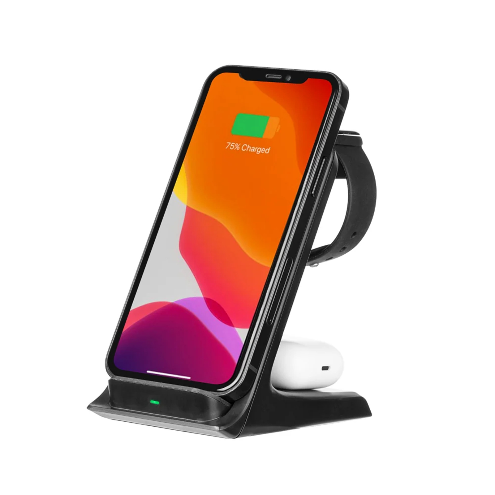 Say goodbye to messy clutter and experience the ultimate solution for charging your Apple or Samsung devices simultaneously with the innovative 3sixT 3-in-1 Charging Station. Its sleek and compact tower design revolutionises your charging experience. With the built-in dual wireless coils, you can effortlessly charge your smartphone in either portrait or landscape mode, harnessing an impressive 15W of power. Designed to charge multiple devices, you can also charge your TWS-compatible earbuds and smartwatch simultaneously. Plus, it includes an AC wall charger and interchangeable smartwatch mounts that are compatible with both Apple and Samsung smartwatch puck chargers.