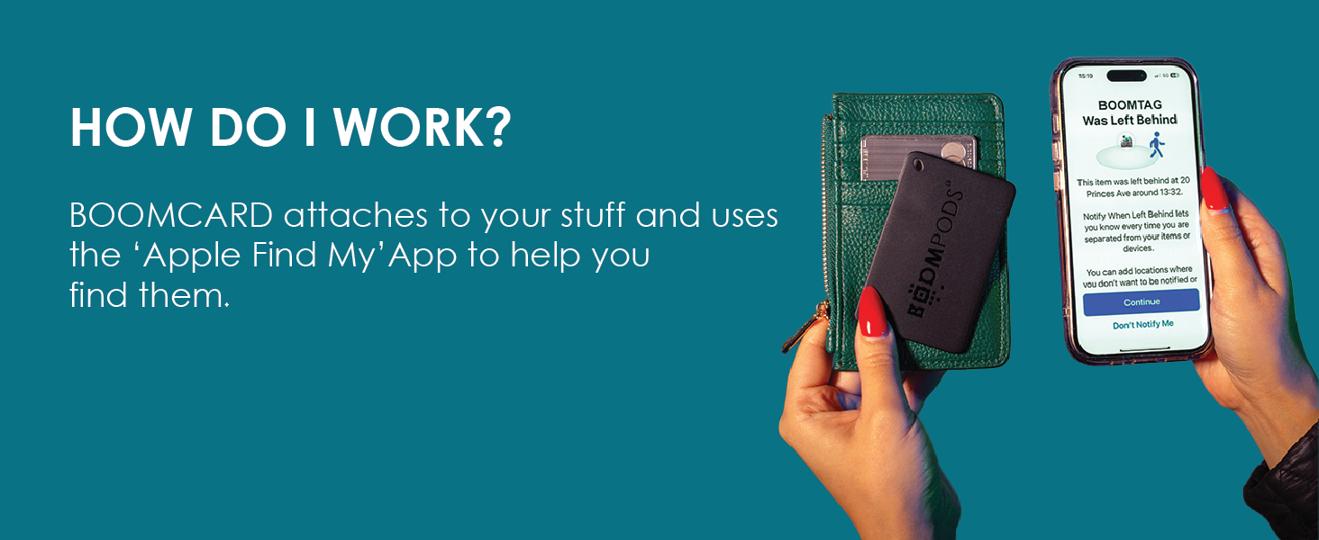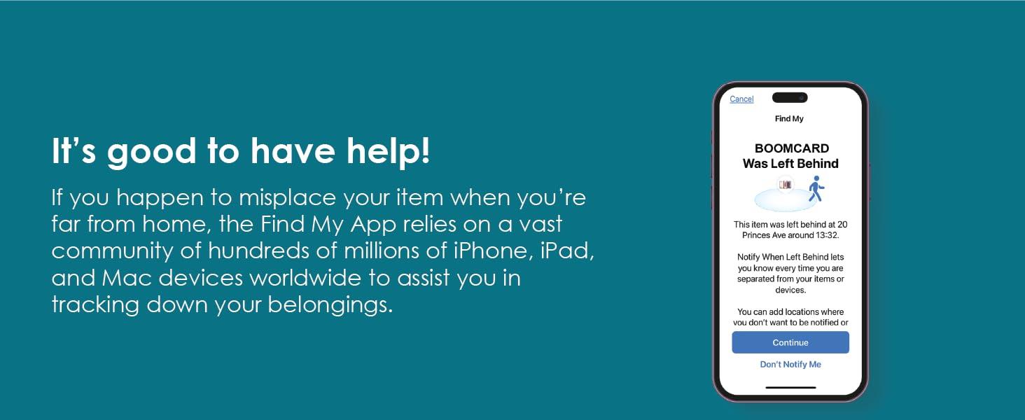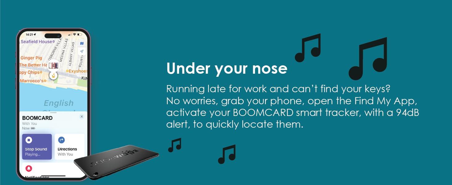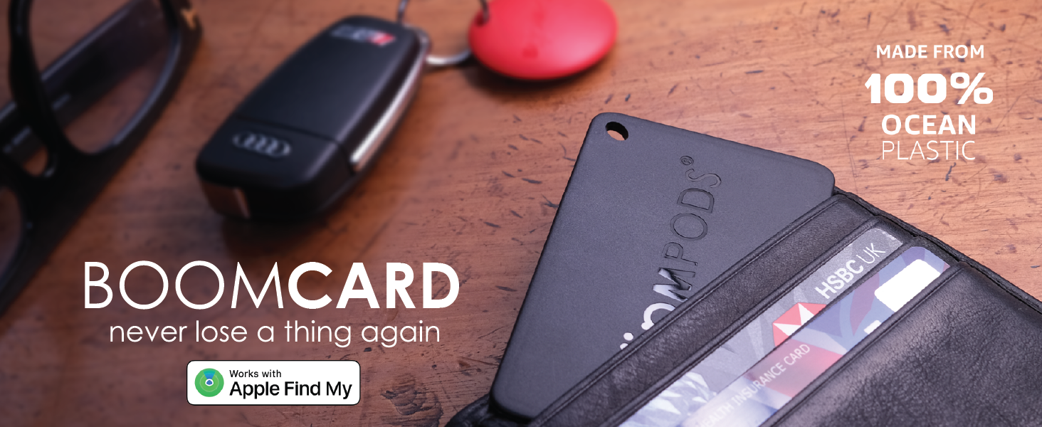 Find lost items with Apple's Find My app and Boomcard, made from 100% ocean-bound plastic for sustainability. Never lose a thing again, while making a positive impact.