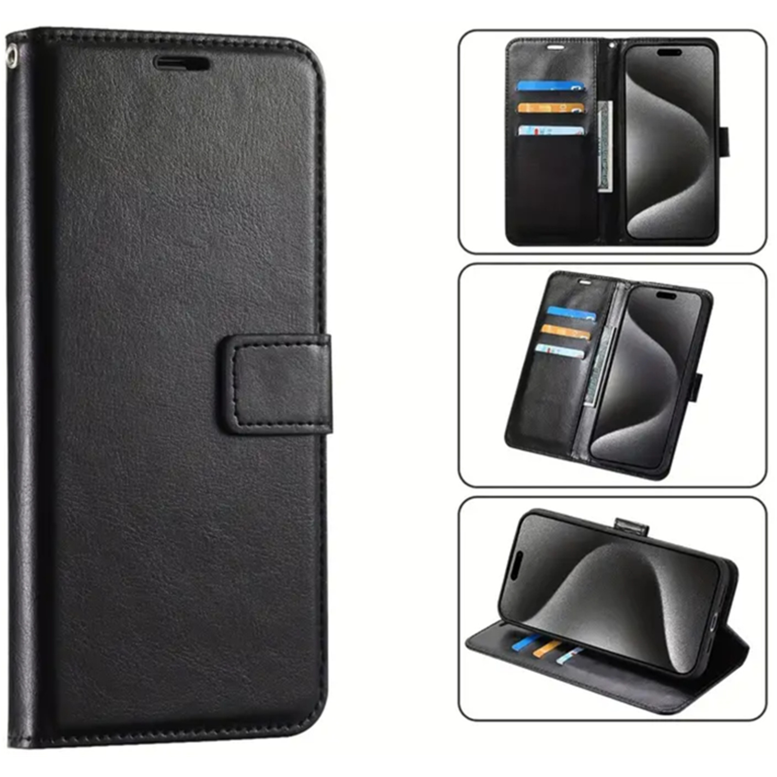 iPhone 15 Flip Wallet Case - Black 3 Card Slots - Cash Compartment - Magnetic Clip
