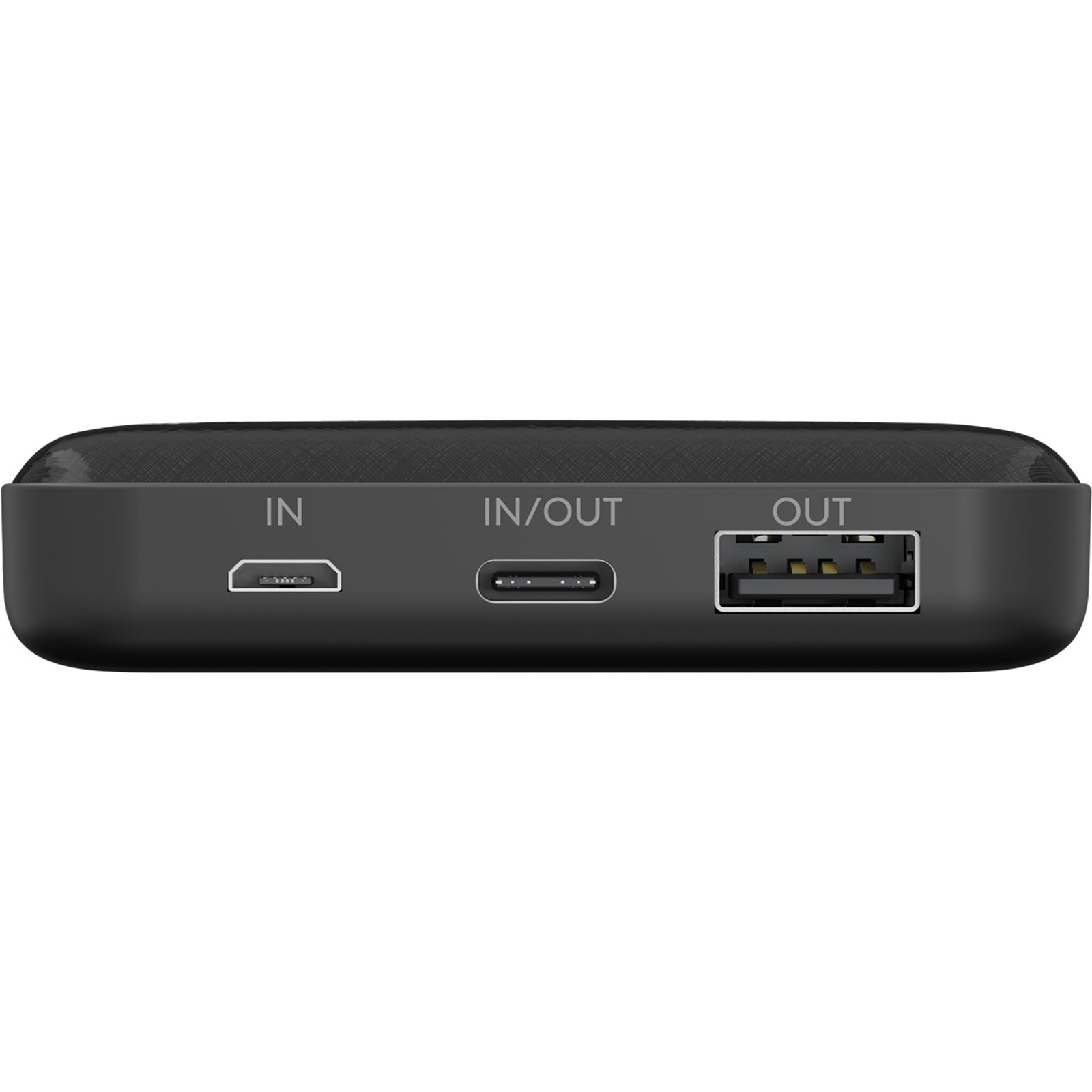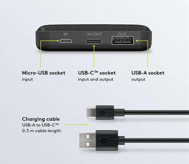 1 x USB-A port (output), 1 x USB-C port (output/input), 1 x micro USB port (input). Ideal for parallel charging of 2 x small devices such as smartphone, smartwatch or headphones. Includes 1 x charging cable with 0.3 m cable length