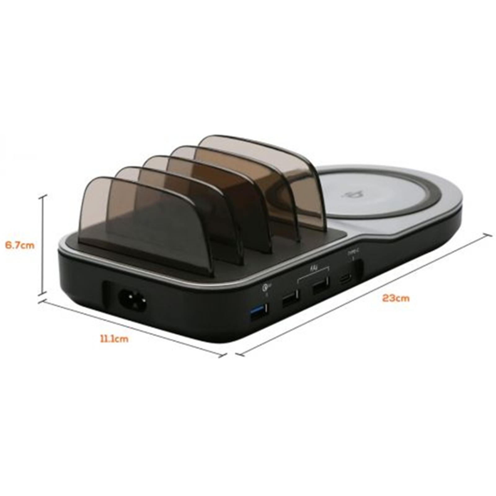 Offers a Quick Charge 3.0 port (up to 18W), two smart USB-A ports (up to 12W each), one USB Type-C port (up to 12W) and a Qi certified wireless charger (up to 10W) to charge five devices simultaneously.
