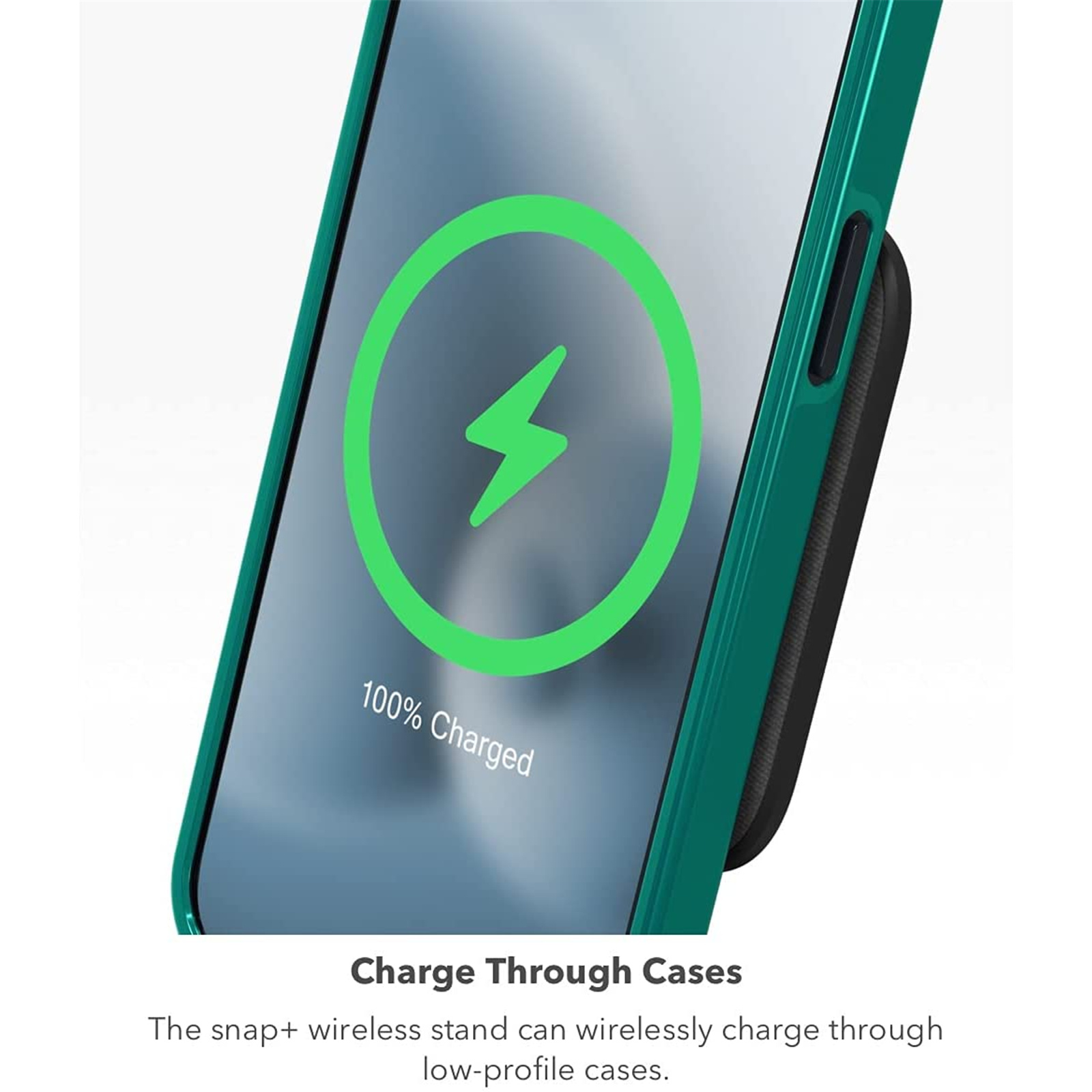 Charge wirelessly while keeping your smartphone at the perfect, convenient angle with the snap+ wireless stand. Strong magnets hold your smartphone in landscape or portrait mode, all while delivering a steady charge. The magnetic array on the snap+ wireless stand is compatible with virtually any Qi-enabled smartphone or with MagSafe for iPhone 12 models. Plus, the stylish design makes this stand a must-have on any desk or nightstand.