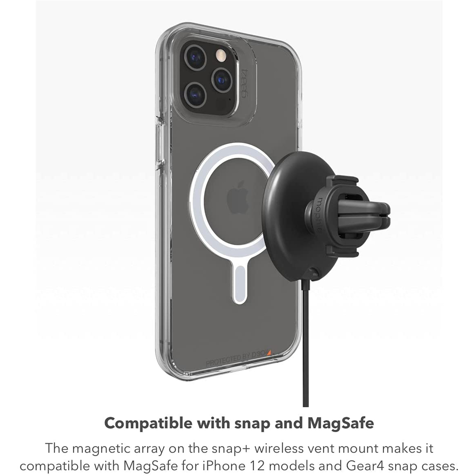 Easily charge while you drive! The snap+ wireless charging vent mount delivers up to 15W of power to your phone while holding it at the perfect viewing angle. The strong magnets secure your phone in place, making it easy to use for GPS navigation or hands-free calling. The charging puck is also removable for added versatility. The snap+ wireless charging vent mount is also compatible with MagSafe for iPhone 12 models.